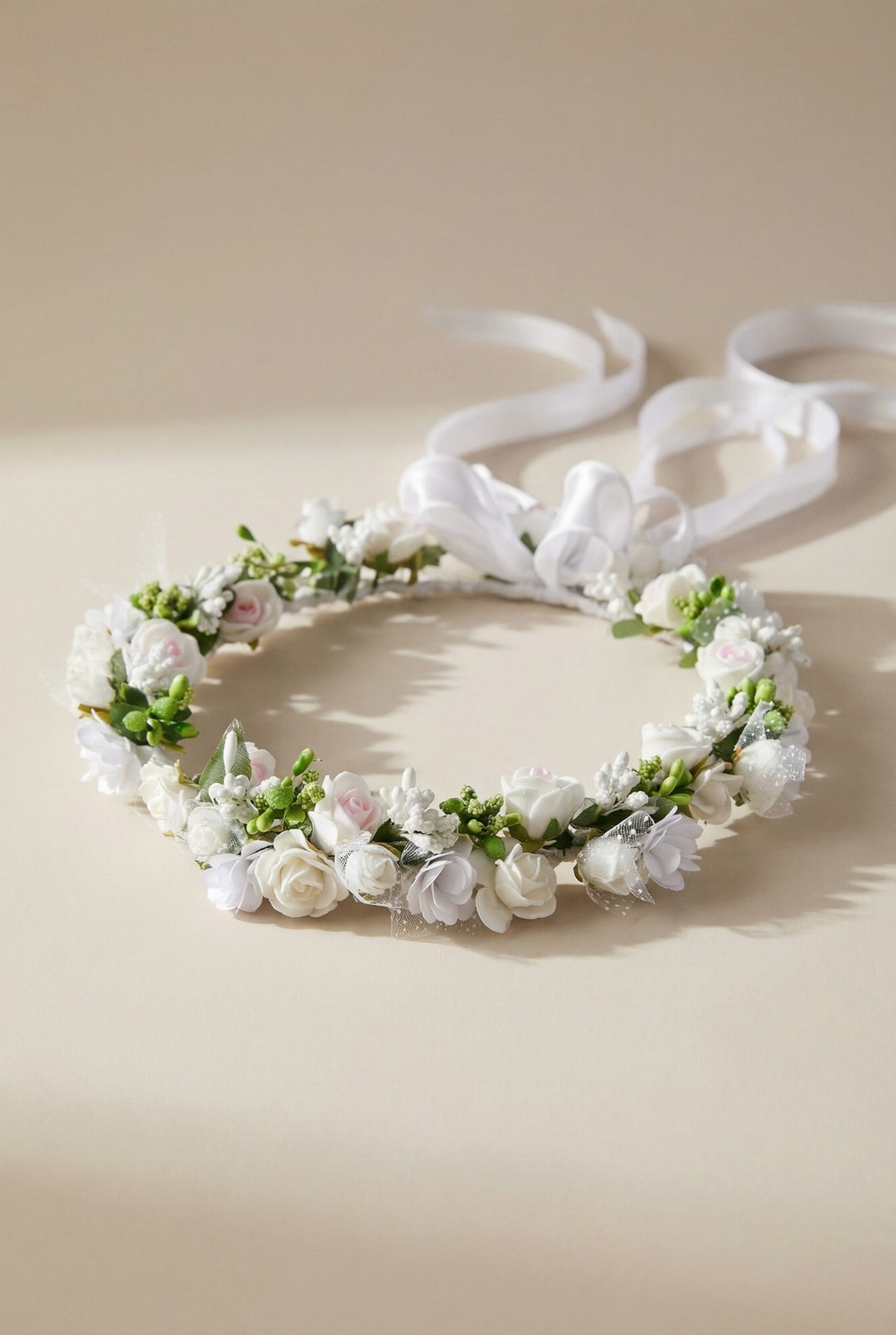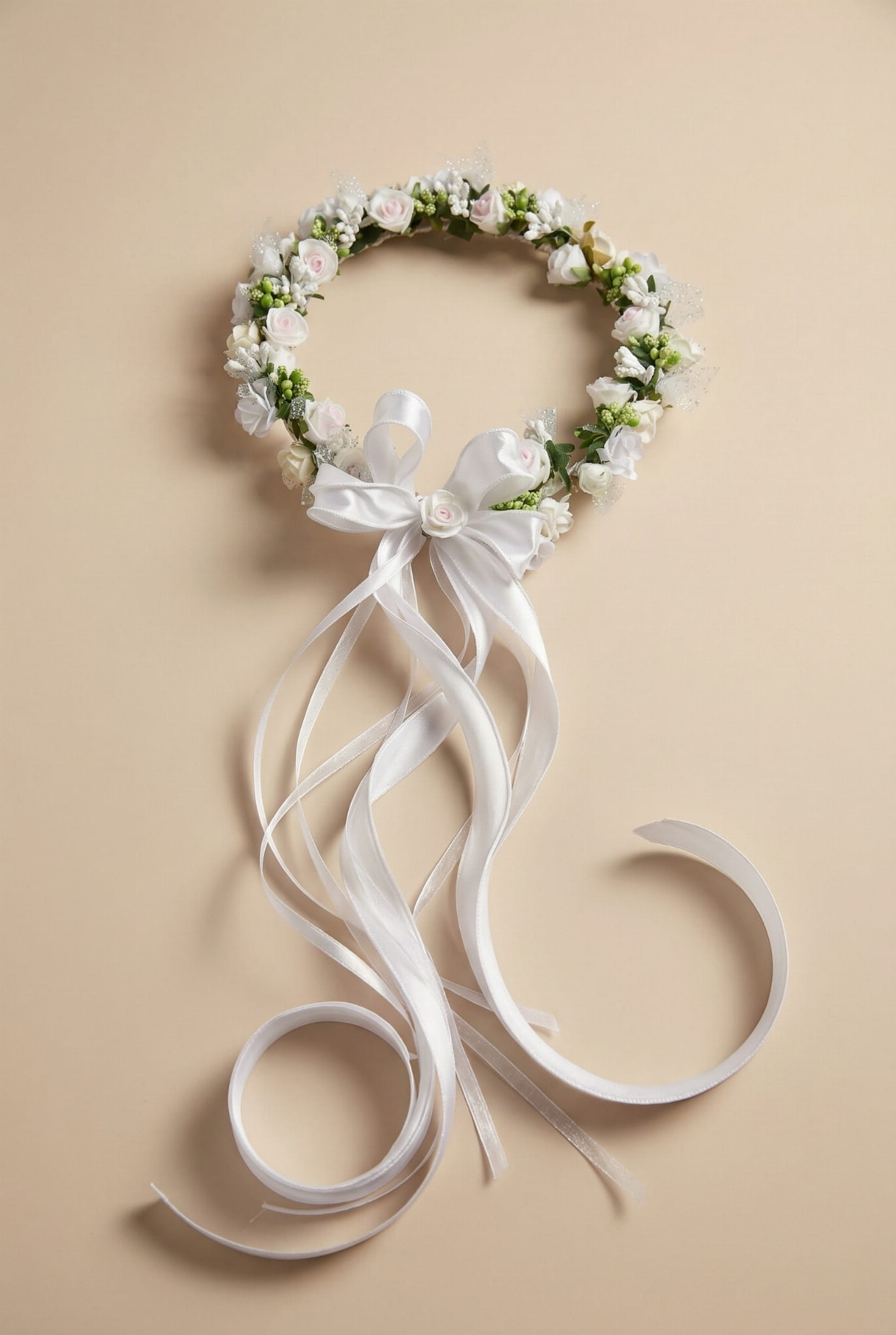 Blomsterkransen är dekorerad med en stilfull satinkokard med lockar, som tillför en känsla av lätthet och frihet. Dessutom är den prydd med satin- och chiffongband som elegant faller ner över axlarna och framhäver den speciella karaktären hos högtiden.