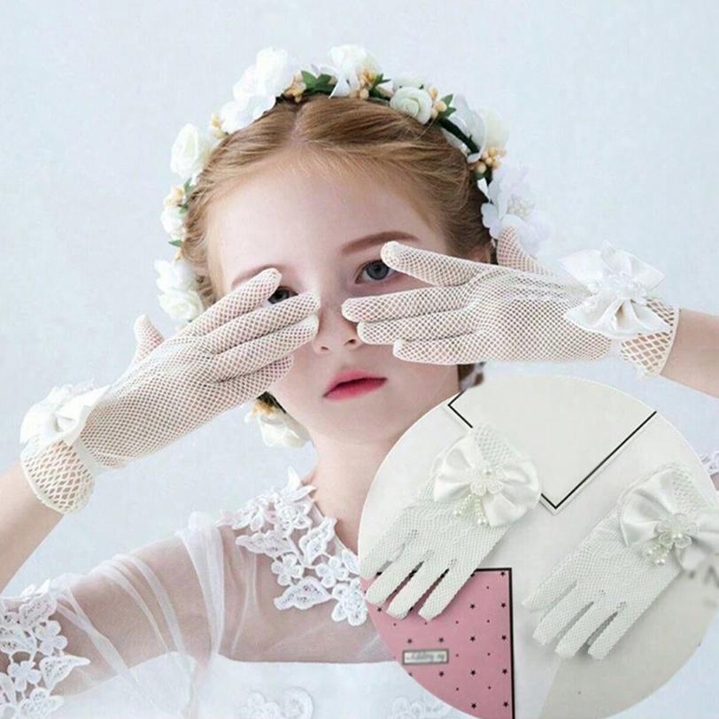 Tillverkade av delikat nät, dessa vita handskar kännetecknas av ett subtilt mönster som inte bara ger ett vackert utseende men också andningsförmåga och bärkomfort. Nätet är mjukt och elastiskt, vilket möjliggör fria handrörelser för barnet, medan en solid finish garanterar hållbarhet och motståndskraft mot rivning.