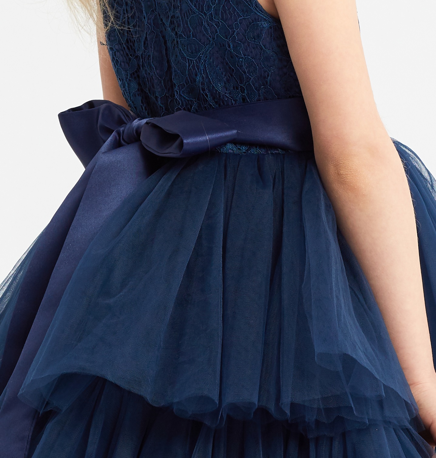 Ståtlig som från ett kungligt hov – Chantal klänning för flickor i marinblå Hur ser en verkligt kunglig klänning för flickor ut? Om du vill veta det, titta på modellen Chantal i färgen marinblå! Det är en skapelse bestående av elegant spets och många lager av lätt tyll i form av en kaskad. Helheten kröns av ett satinbälte med dekorationer. En sådan kombination garanterar att din dotter kommer att se ut som en prinsessa från en saga.