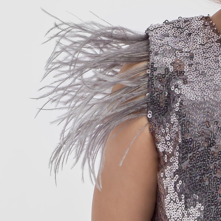 Överdelen av klänningen är dekorerad med paljetter, och underdelen är gjord av tyll med ett foder. Den unika charmen ges av delikata fjädrar som sträcker sig från klänningens axelband. Tillverkad av högkvalitativt material som erbjuder tillfredsställande lätthet under dans och lek.