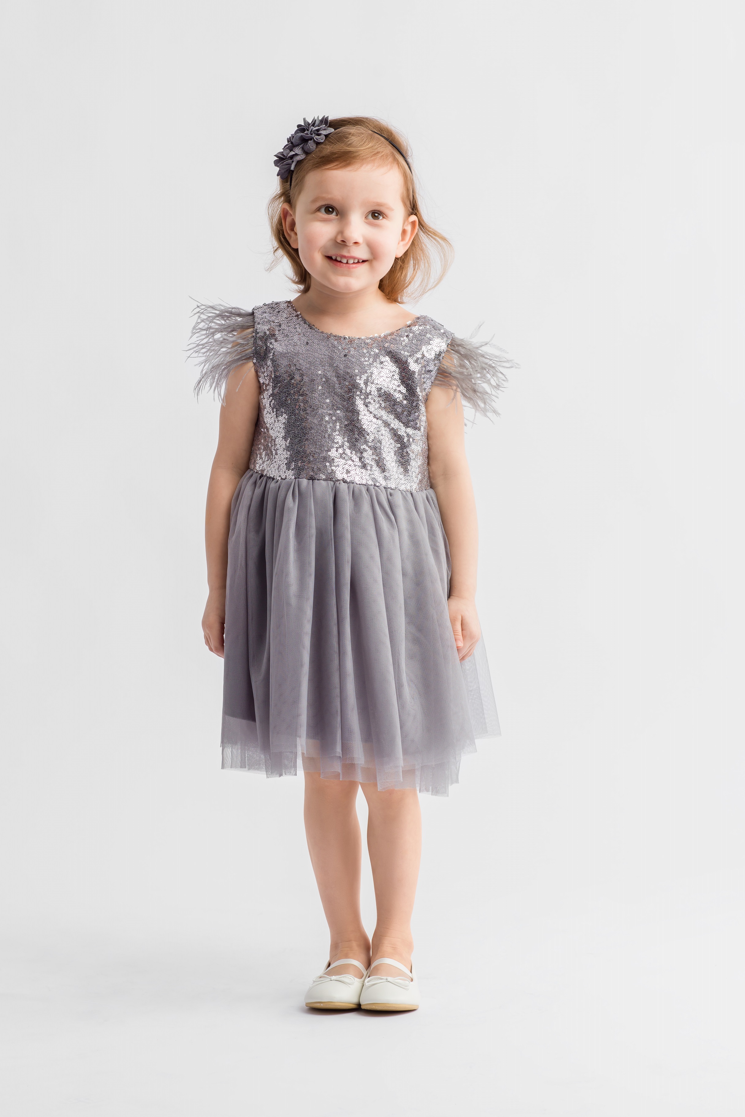 Stilfull och elegant festklänning för flickor, Chloe i grått med paljetter.