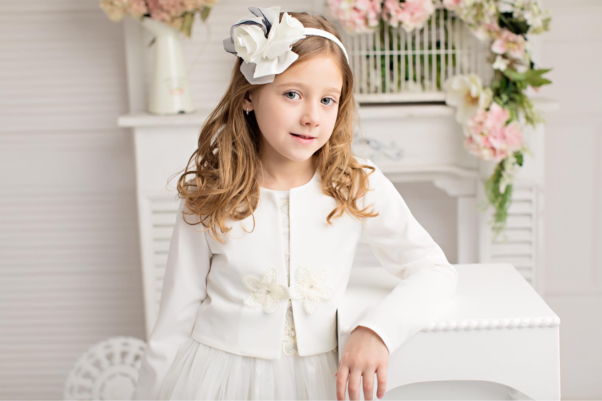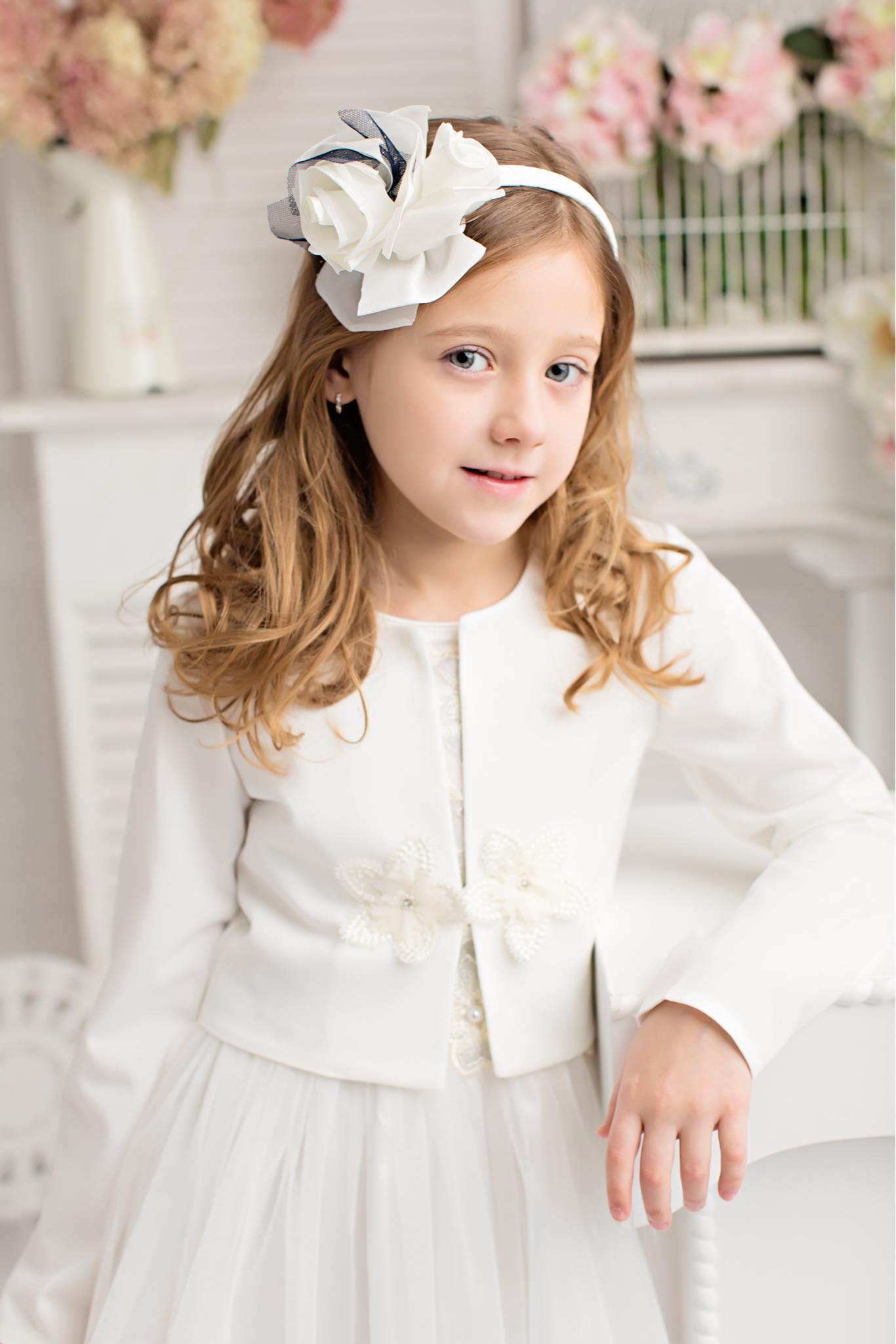 Barnbolerot Clea är själva inkarnationen av finess och flickaktig grace, och utgör ett perfekt komplement till varje ceremoniell outfit. Modellen med en knappstängning betonar lätthet och frihet, samtidigt som den enkelt kan tas på över en klänning utan att störa helheten i outfitens komposition. Bolero Clea har dekorerats med en särskild omsorg om detaljer - delikata blommor som dekorerar stängningsområdet ger den en unik karaktär och elegans.
