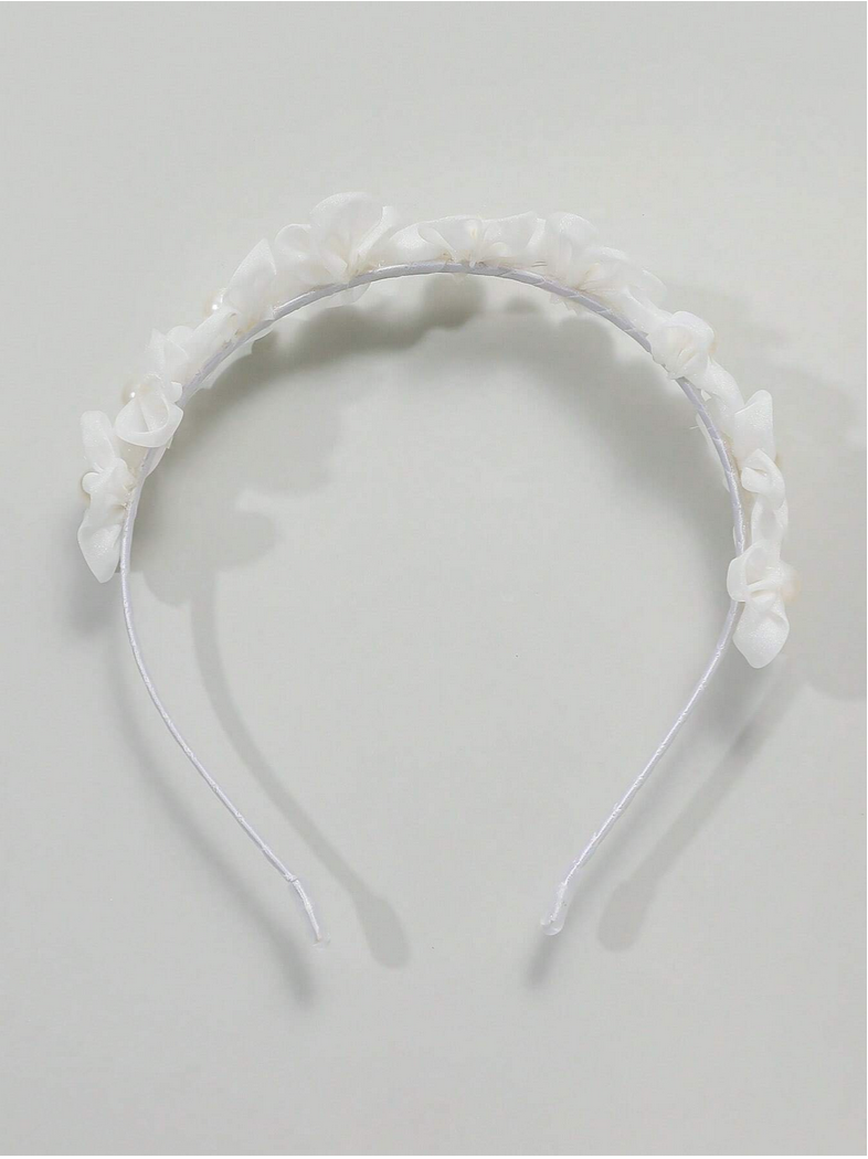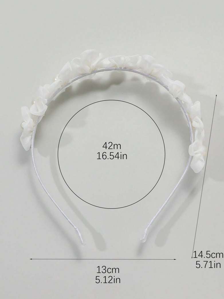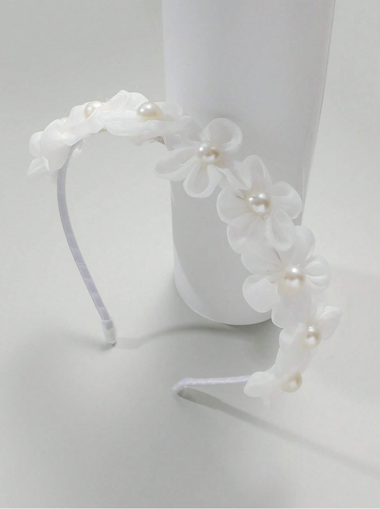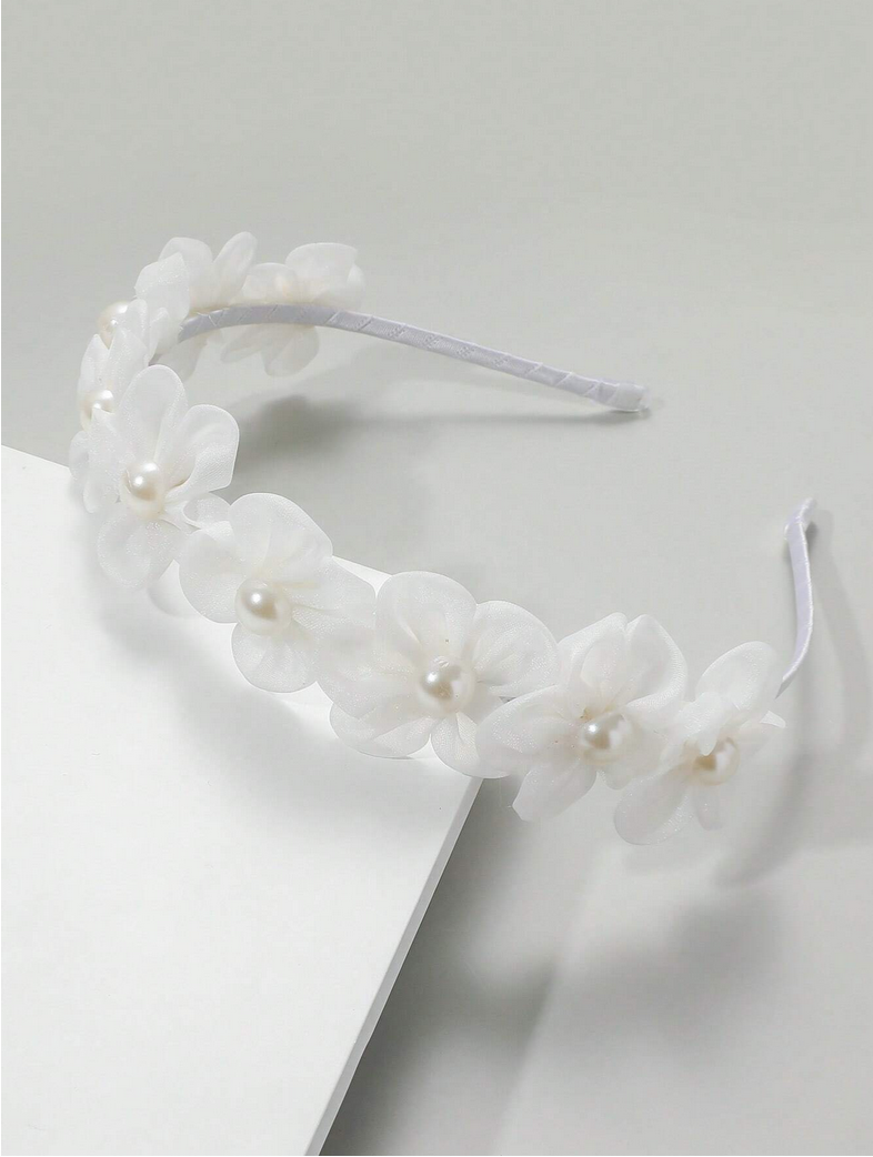 Hårbandet är dekorerat med vackra, små blommor tillverkade av lätt tyllmaterial, vilket ger det en luftig och flickaktig charm. Varje blomma är dessutom smyckad med en skimrande pärla i mitten – en subtil men effektfull detalj. Denna kombination gör att hårbandet ser både delikat och elegant ut.