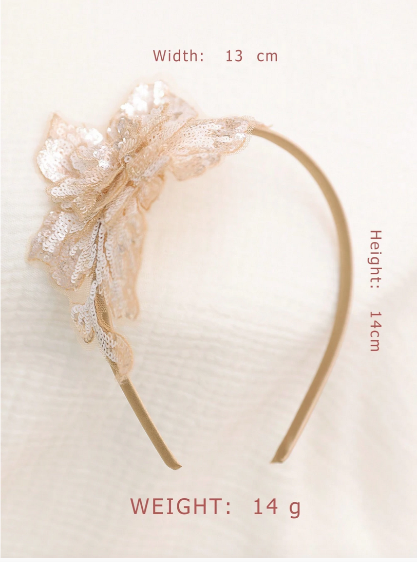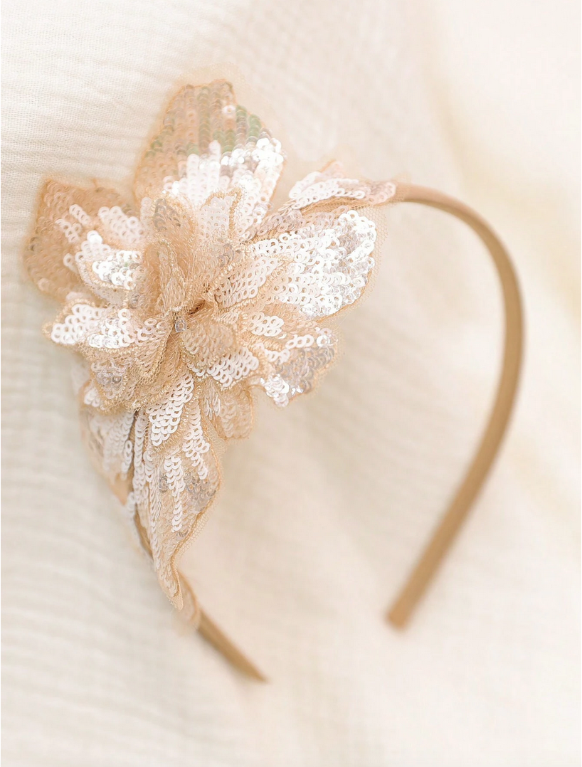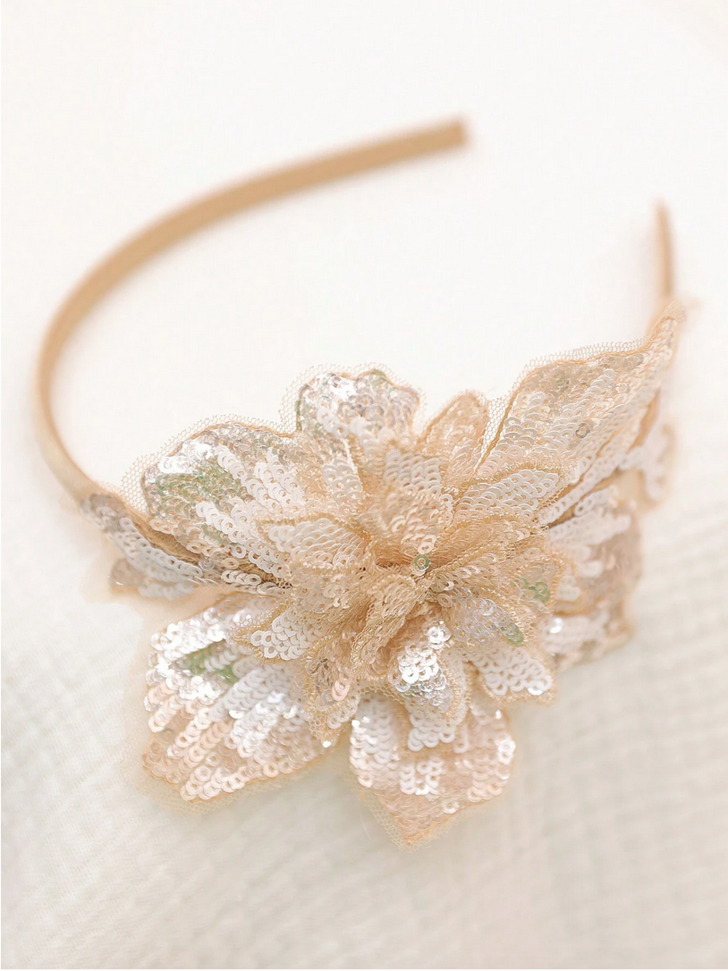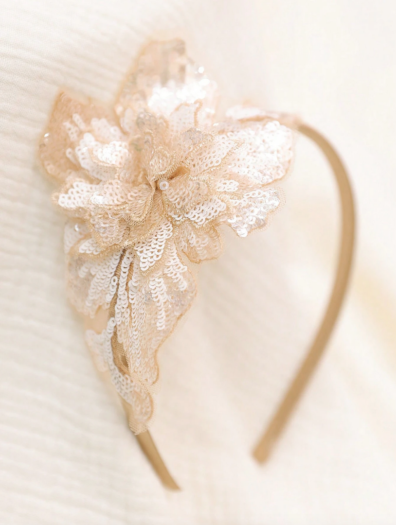 Hårbandet är dekorerat med paljetter i en subtil guldnyans som vackert reflekterar ljuset och tillför glans och mjukhet till helheten. Paljetterna är noggrant fastsydda på en blommig dekoration, vilket skapar en tredimensionell, glittrande effekt som fångar uppmärksamheten. Blomman är finstämd men samtidigt imponerande, vilket gör att hårbandet kompletterar både eleganta klänningar och mer vardagliga kläder.