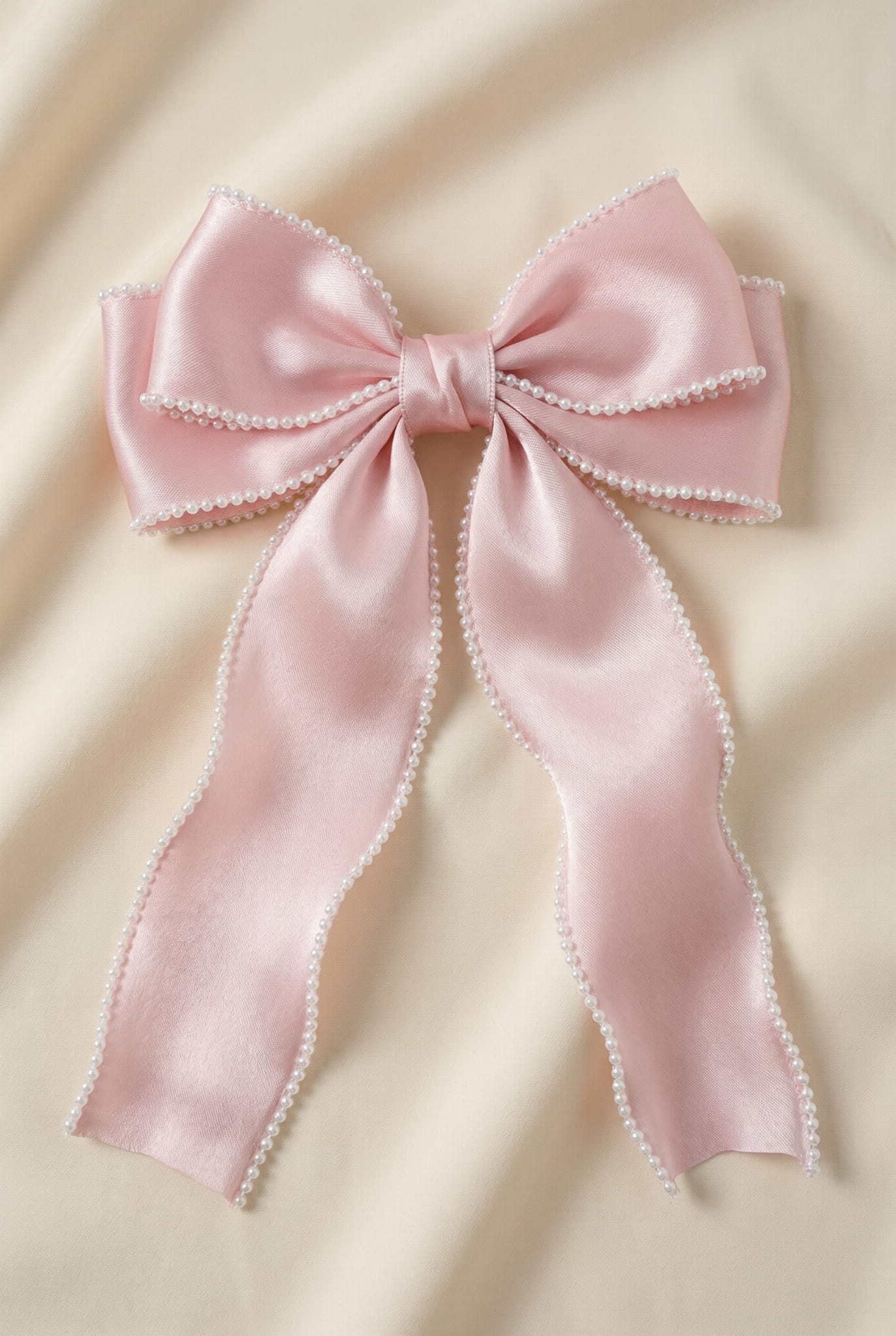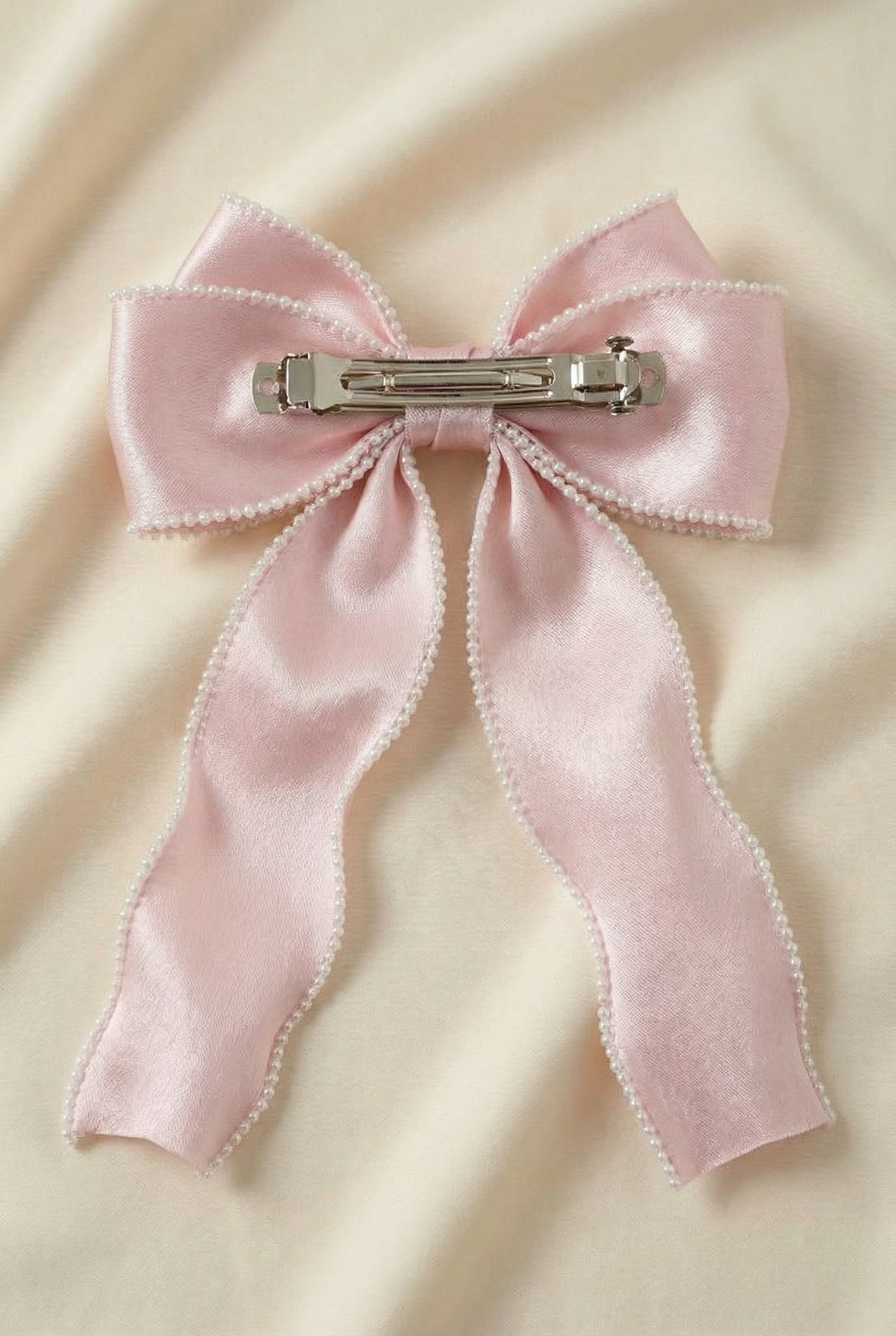 Detta charmiga hårspänne med en lång rosett är ett perfekt val för små damer som vill se eleganta och stiliga ut vid alla festliga tillfällen. Tillverkat av skir organza i en subtil rosa nyans och dekorerat med små vita pärlor, utstrålar det både finess och flickaktig charm.