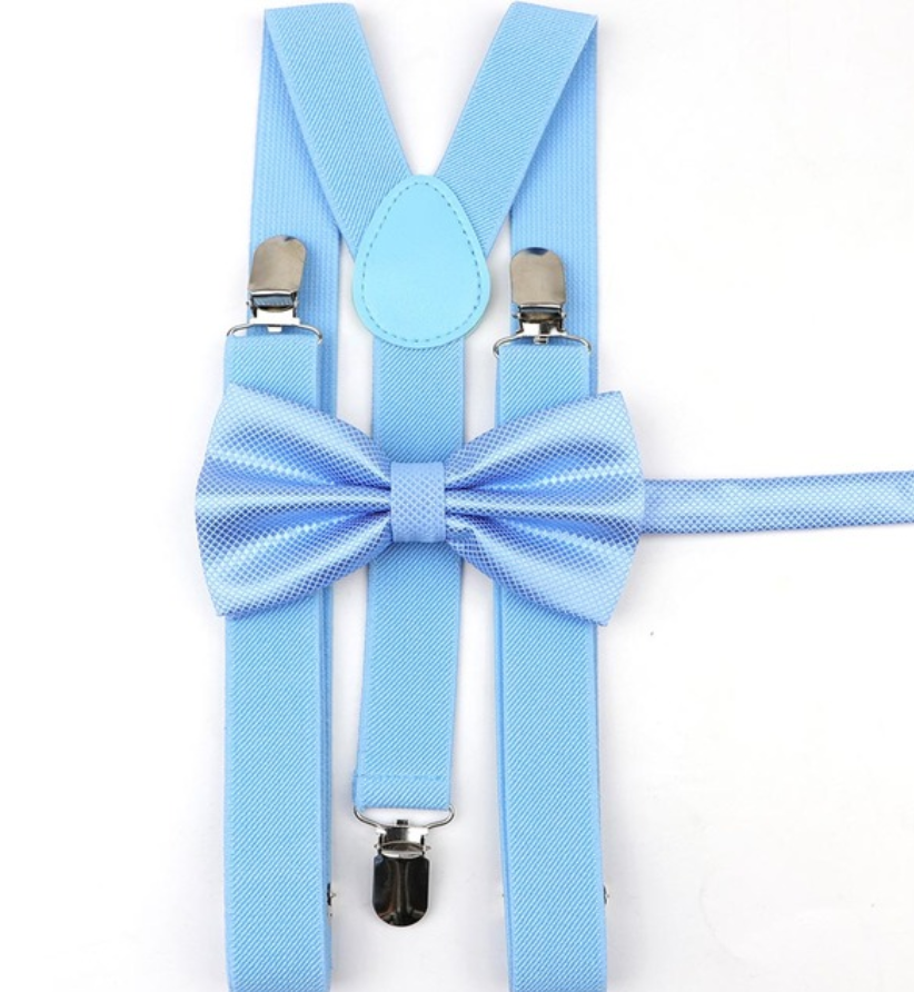 Vi presenterar ett professionellt set för pojkar som består av eleganta hängslen och en fluga.