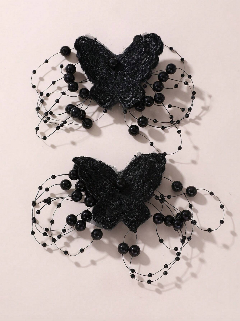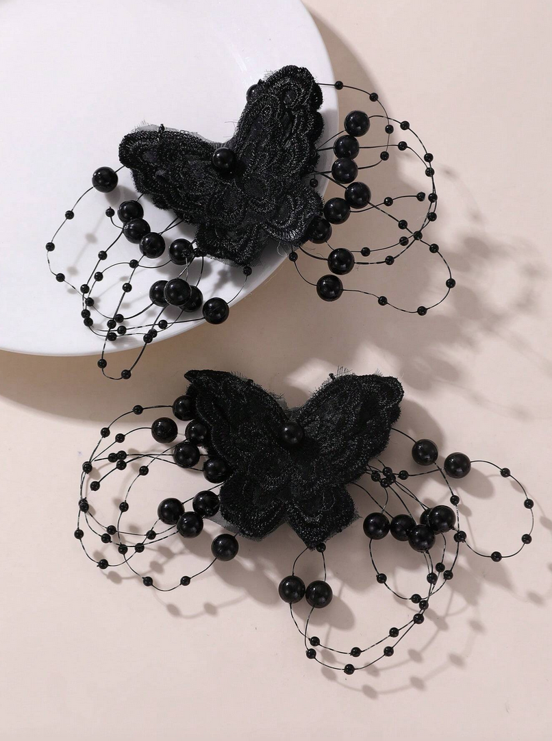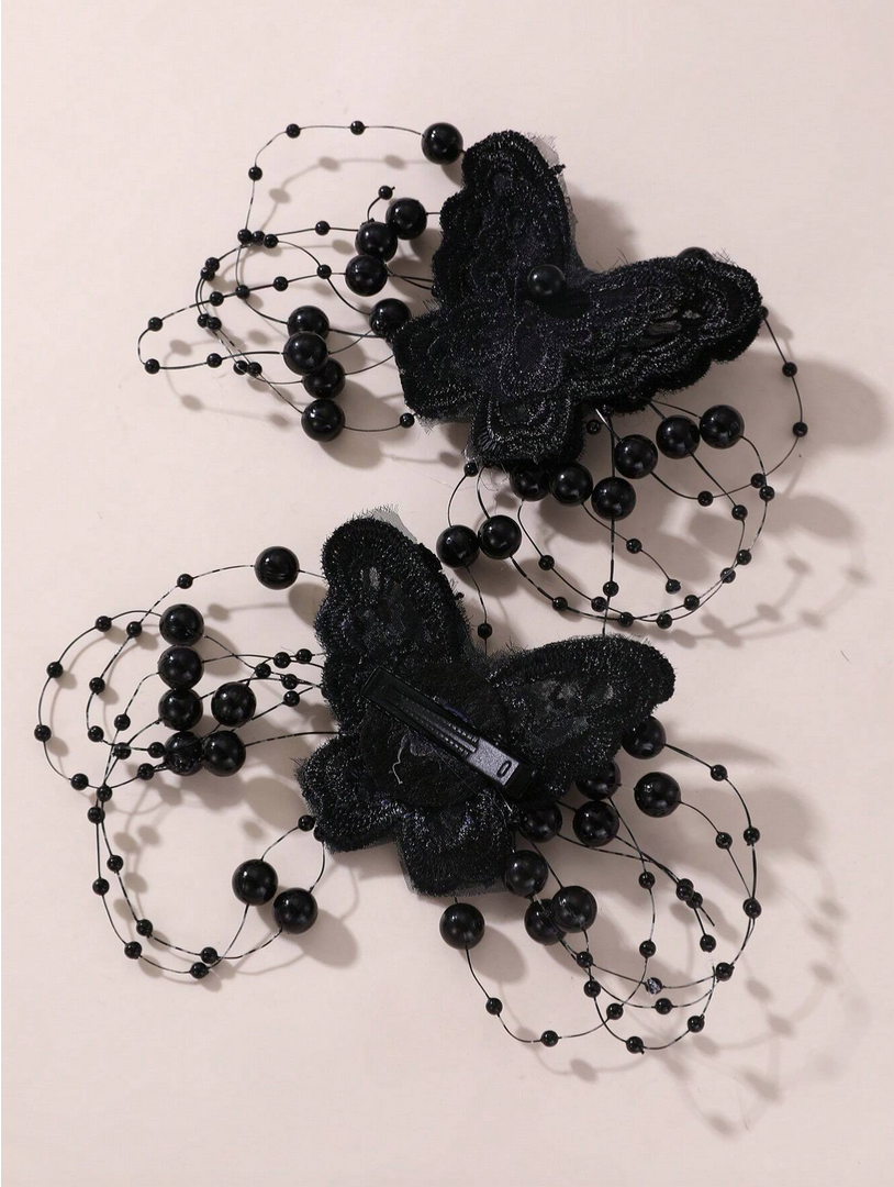 Tillverkade av fin spets med ett detaljerat mönster imponerar spännena med sin subtilitet och eleganta finish. Varje fjäril är dekorerad med svarta pärlor placerade på tunna trådar, vilket skapar en effektfull komposition full av lätthet och rörelse. De intrikat sammanvävda pärlorna ger spännena ett mycket elegant utseende och tillför samtidigt en sagolik känsla till flickans frisyr.