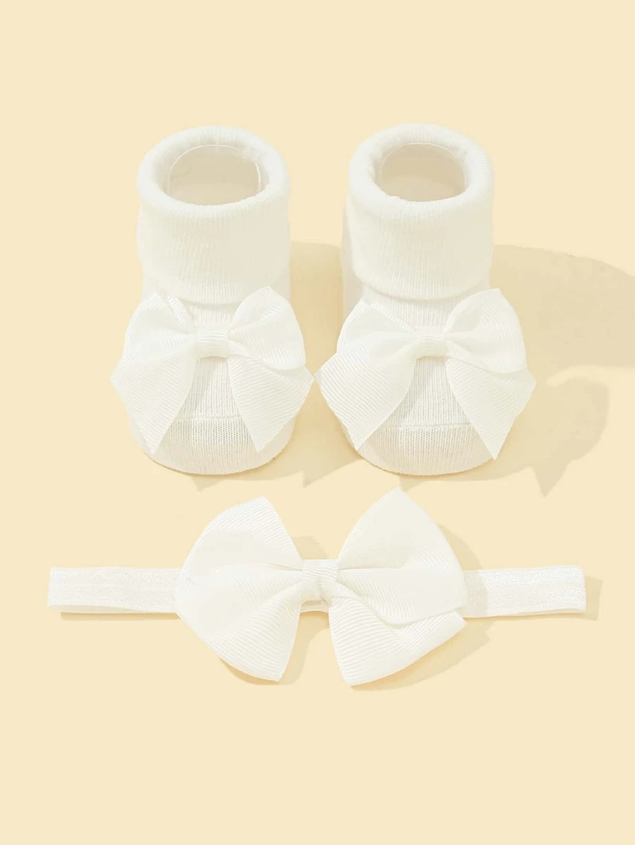 Setet inkluderar strumpor och ett hårband på ett mjukt elastiskt band i vitt.