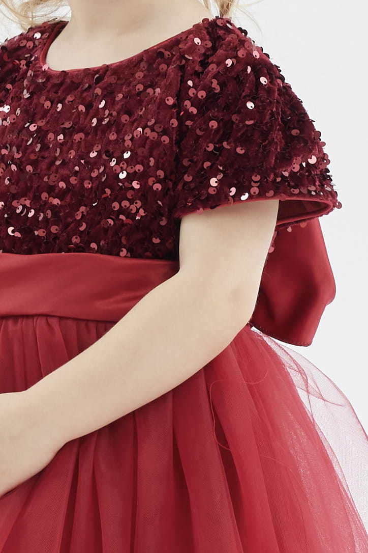Här är Elisa-klänningen – ett utsökt exempel på barnens festmode som förvandlar varje liten dam till en sann prinsessa. Dess djupa burgundyfärg, brutet av skimrande paljetter, gör den till ett konstverk som drar blickar och skapar beundran.