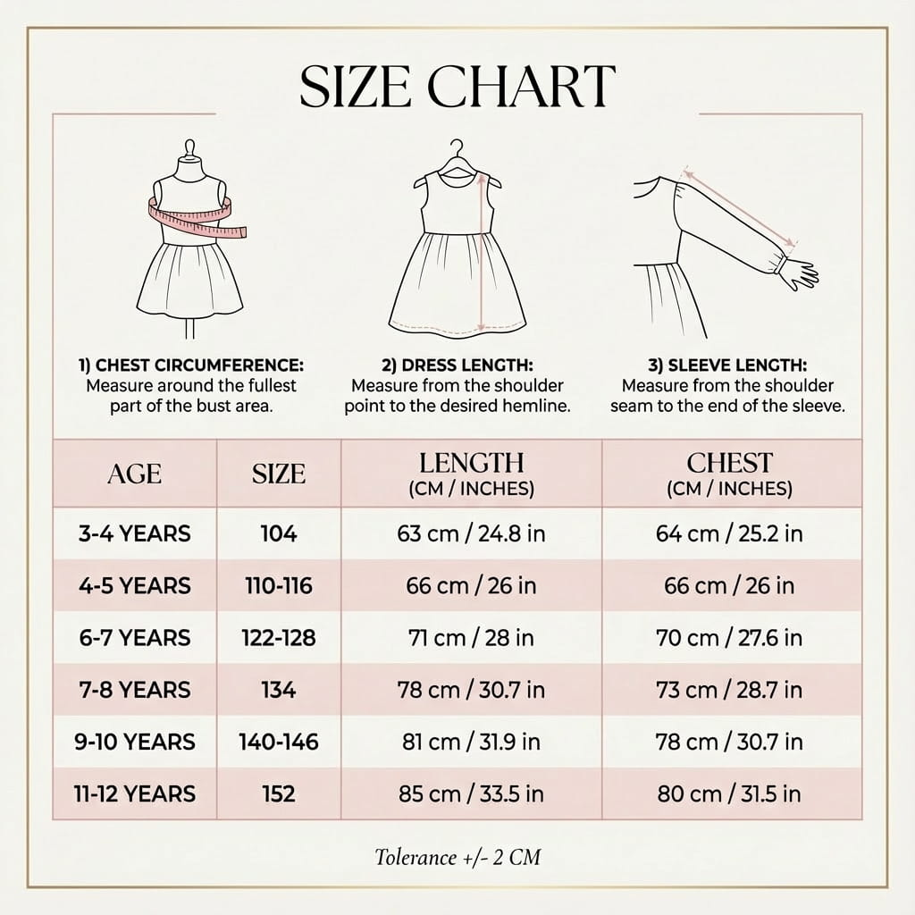 För att säkerställa att Rina sitter som gjuten, har vi tagit fram en detaljerad tabell. Vi rekommenderar att ni mäter barnet noggrant för att hitta den storlek som ger både komfort och den rätta eleganta silhuetten.