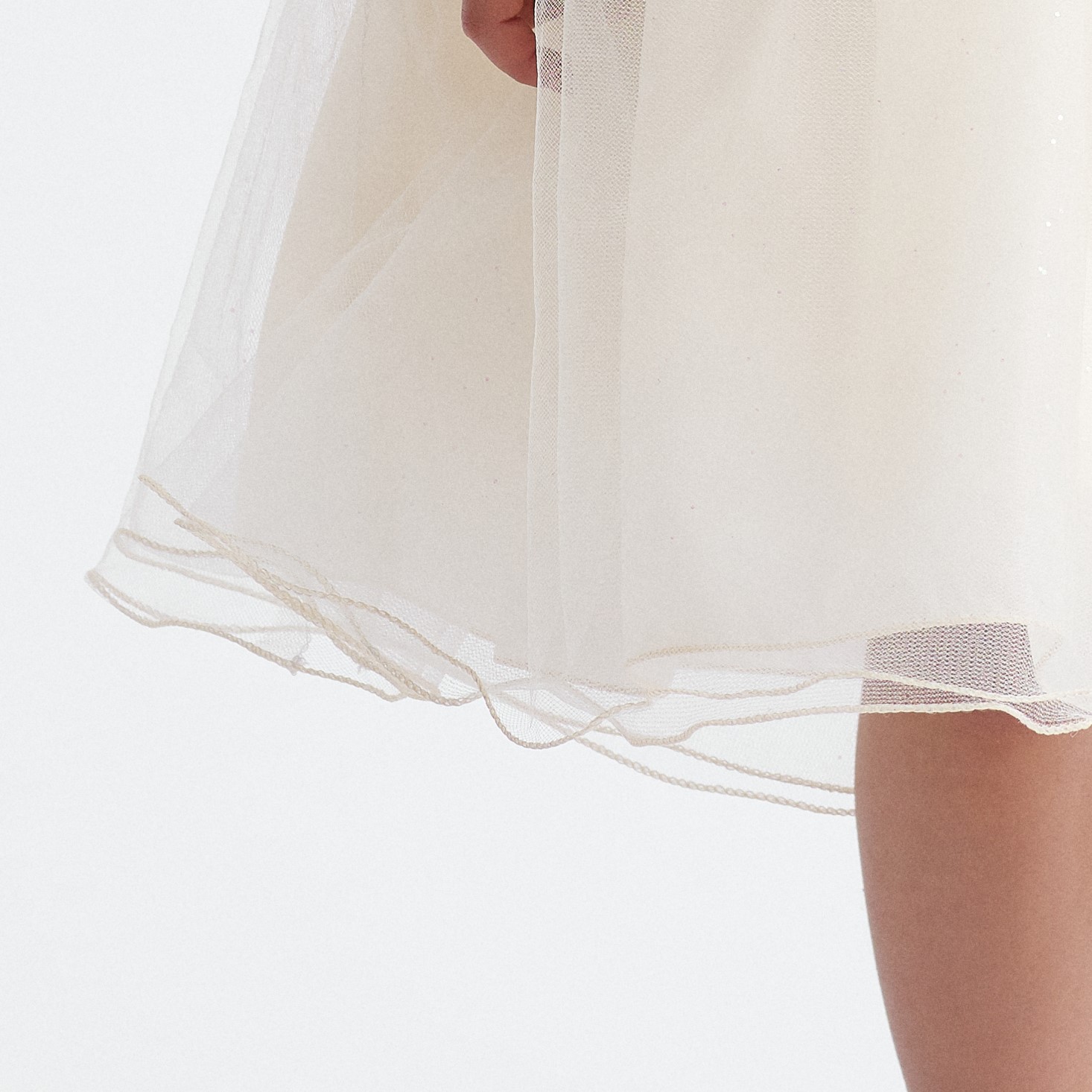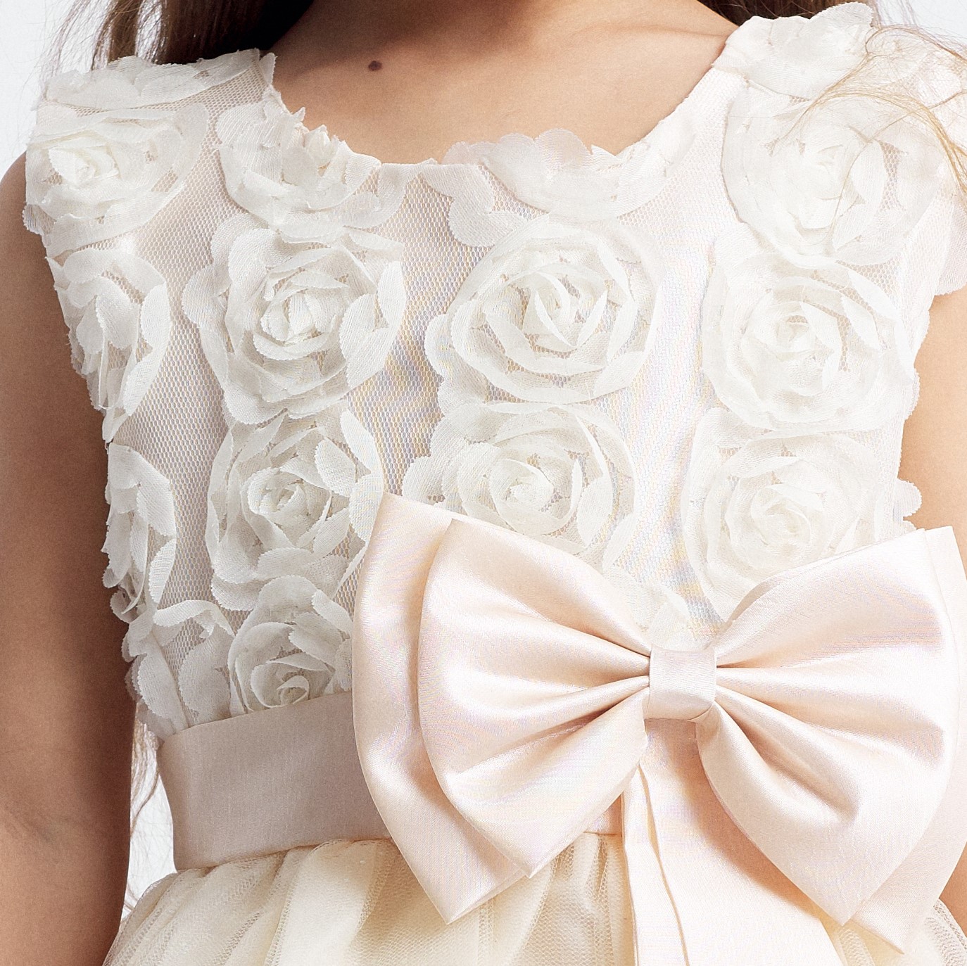 Övre delen av klänningen består av flera 3D-blommor i tyg som ger klänningen en romantisk karaktär. Underdelen består av två lager glittertull, vilket ger skapelsen lätthet och ett subtilt glitter. De faller vackert under vilda danser och lekar. De kommer att förtrolla alla som ser din dotter.