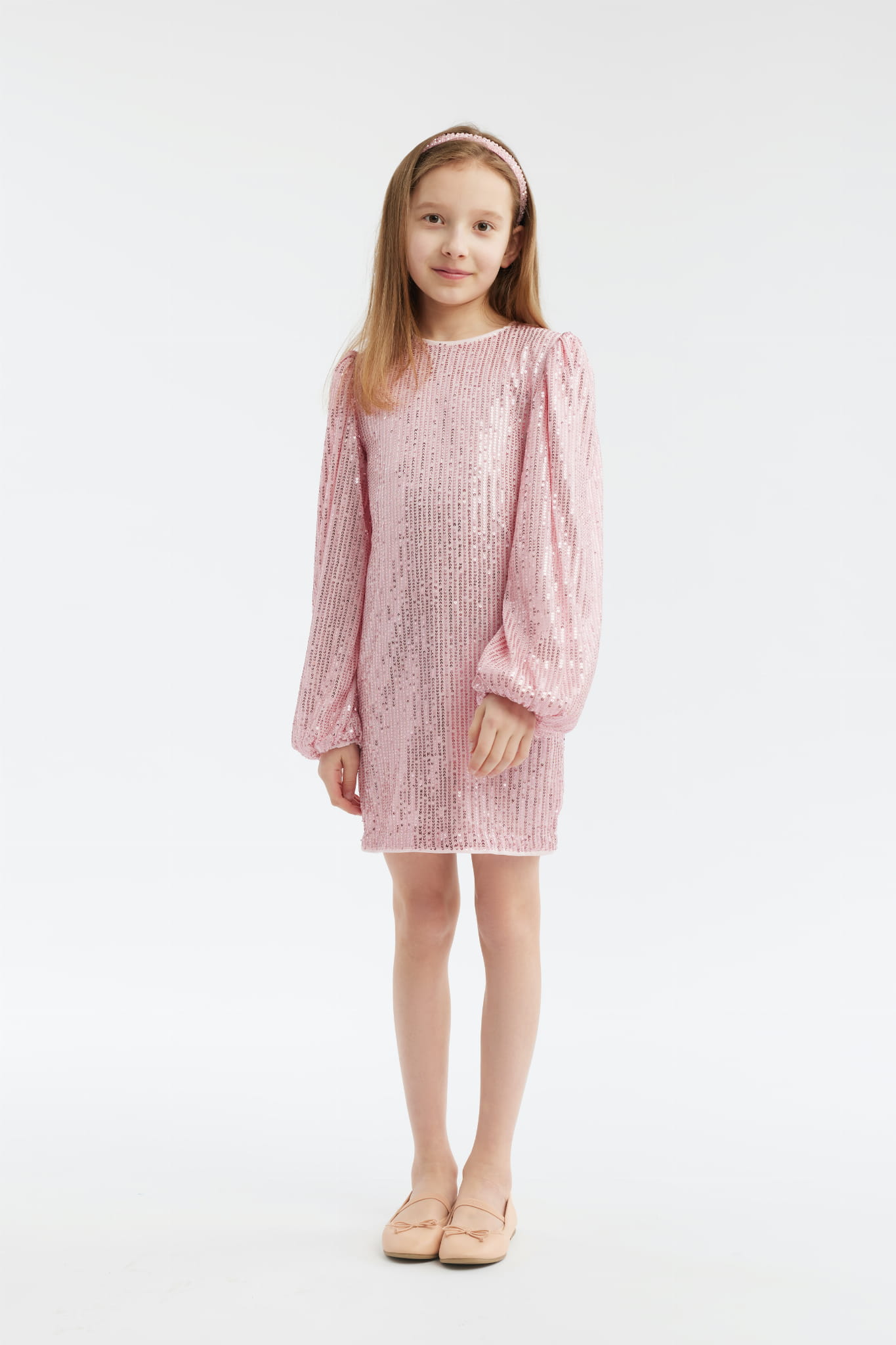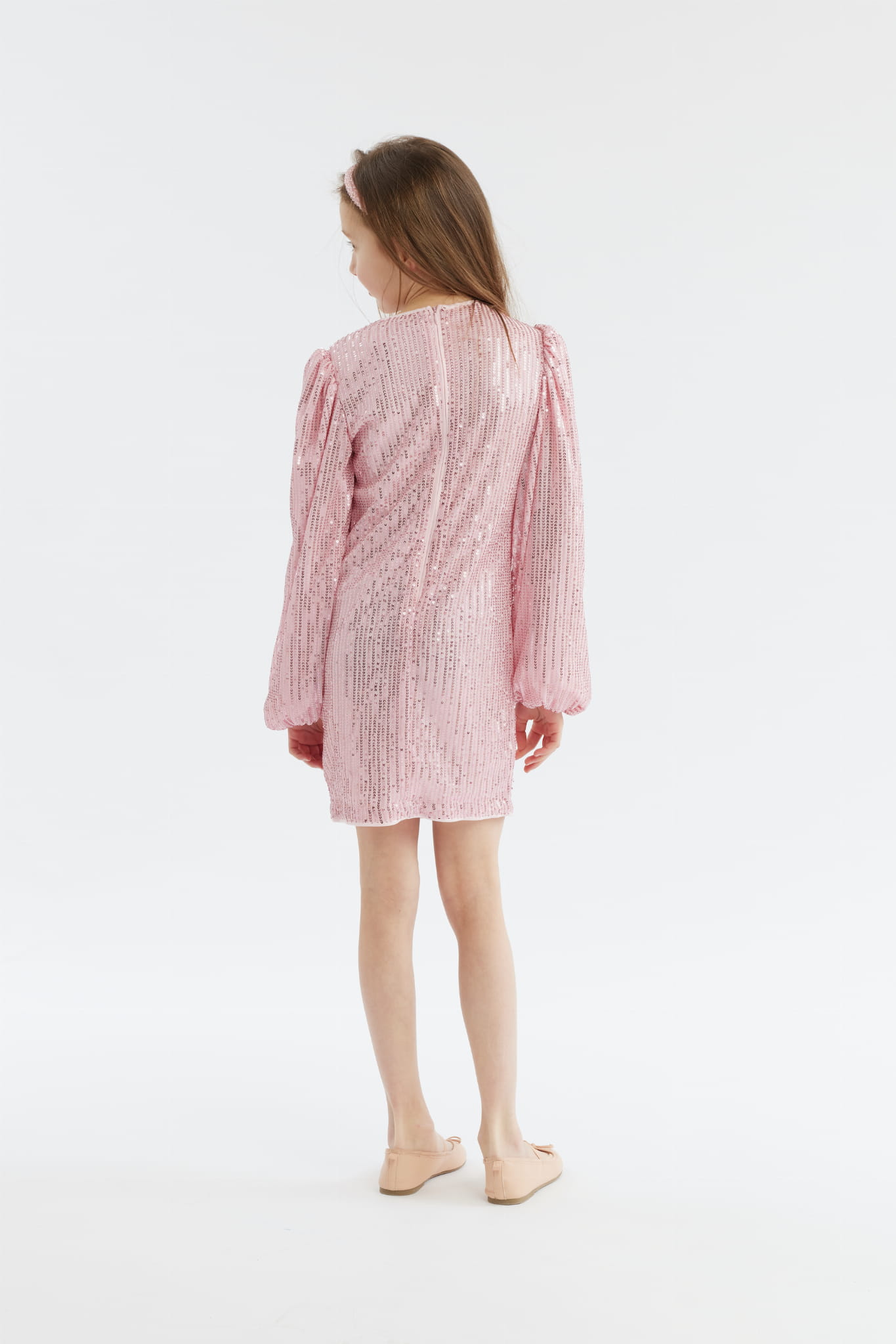 Särskilt uppmärksamhet dras till de imponerande ärmarna med en lätt puffig design, som lägger till en touch av extravagans till klänningen Gabriela, samtidigt som den behåller en aura av barnslig oskuld. Hela klänningen är kantad med rosa paljetter som gnistrar och glänser vid varje rörelse, fångar blickar och gör klänningen till ett verkligt eftertraktat objekt vid varje fest.