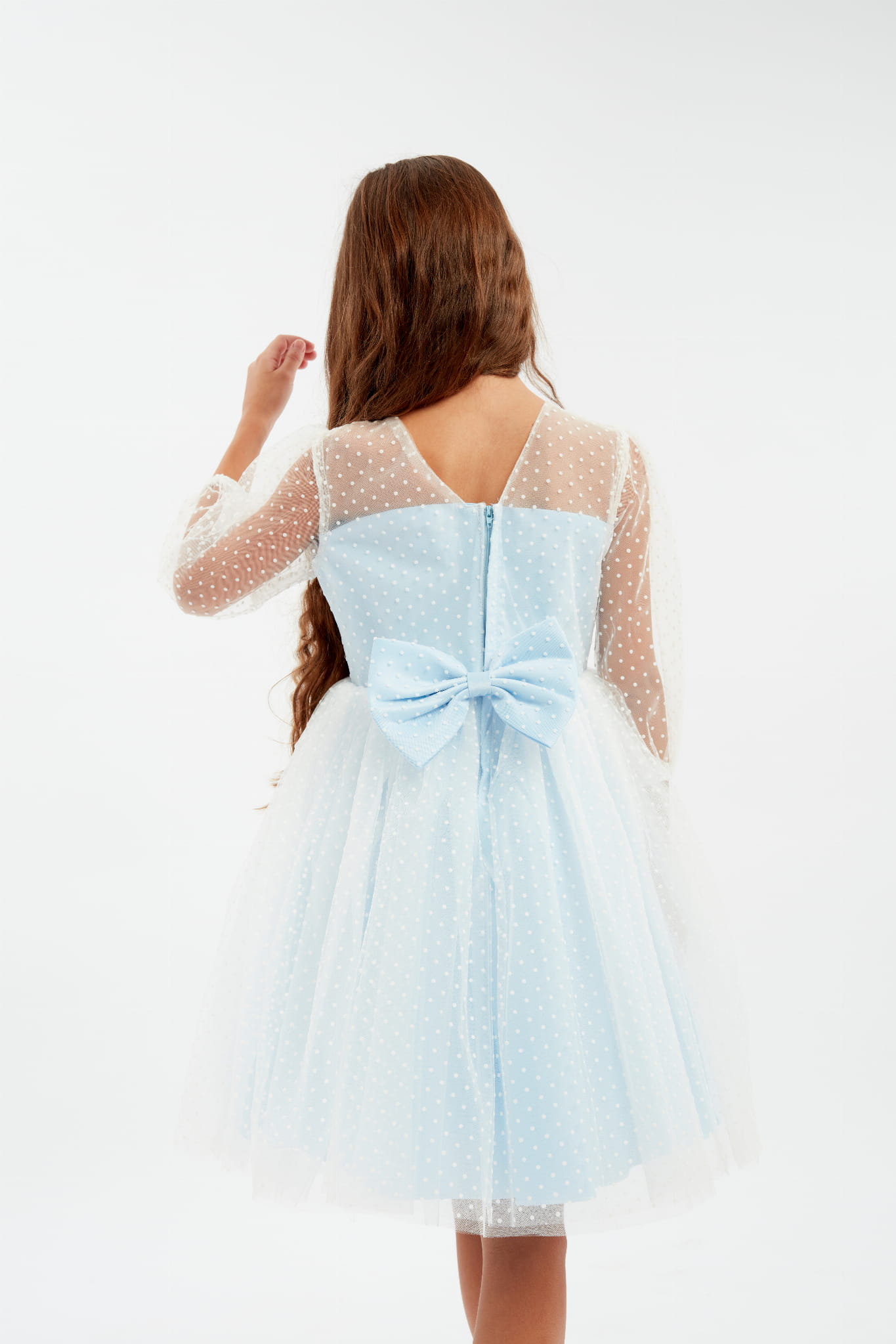 Varje ung dam som bär denna skapelse kommer omedelbart att känna sig som en sann sagoprinsessa, vilket understryker dess unika karaktär. Klänningen har en överdel av vackert prickigt tyll, kompletterad med en effektfull avtagbar rosett, som lägger till en charmig touch för varje liten dam. Tillverkad av högkvalitativa material, garanterar denna klänning inte bara ett vackert utseende utan även bekvämlighet under användning.