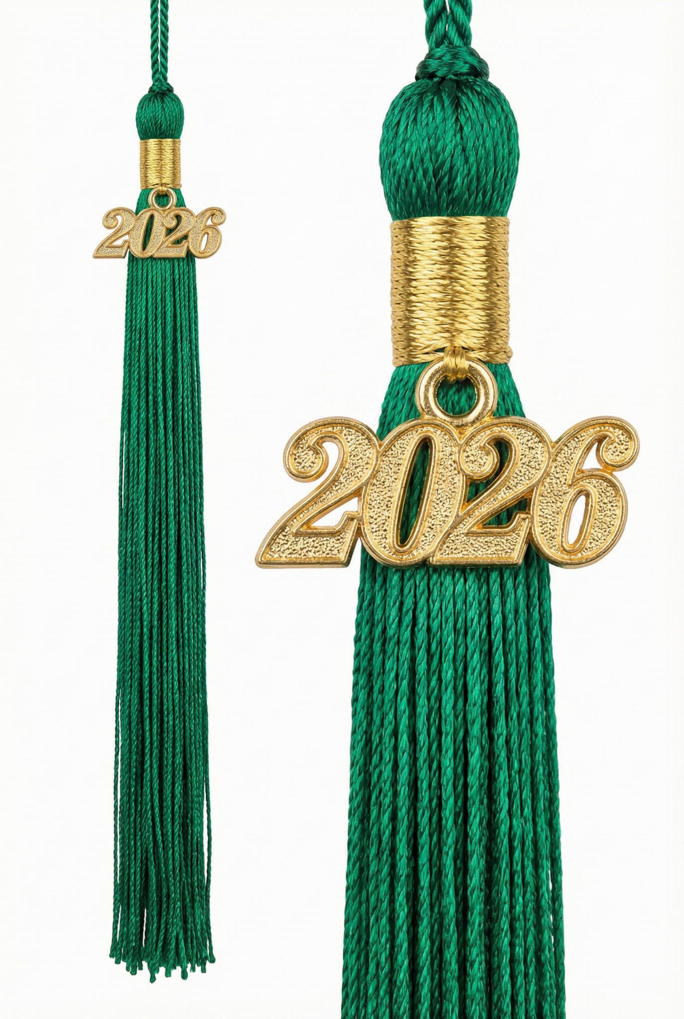 Matchande grön tofs och guldfärgad berlock med årtalet för detta år