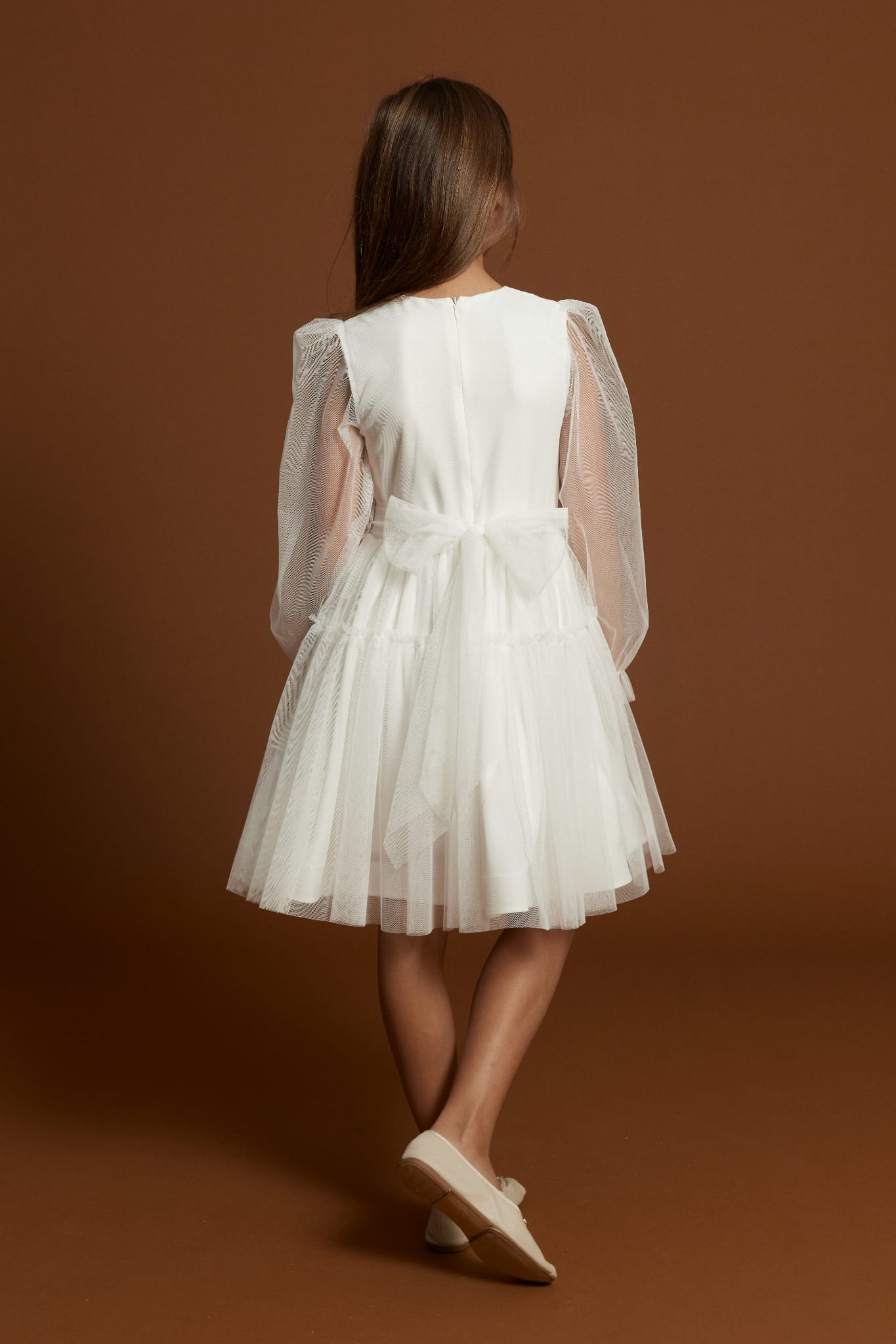 Mjuk bomullsfodring som andas och skyddar känslig barnhud. Transparenta tyllärmar som ger elegans utan att väga ner. Rund halsringning som ger en klassisk look. Knälång modell som tillåter rörelsefrihet. Dragkedja i ryggen för enkel av- och påklädning. Tidlös cremevit nyans som aldrig går ur stil. EU-produktion med kvalitet du kan lita på. Tillgänglig i storlekar från 128 cm till 158 cm.
