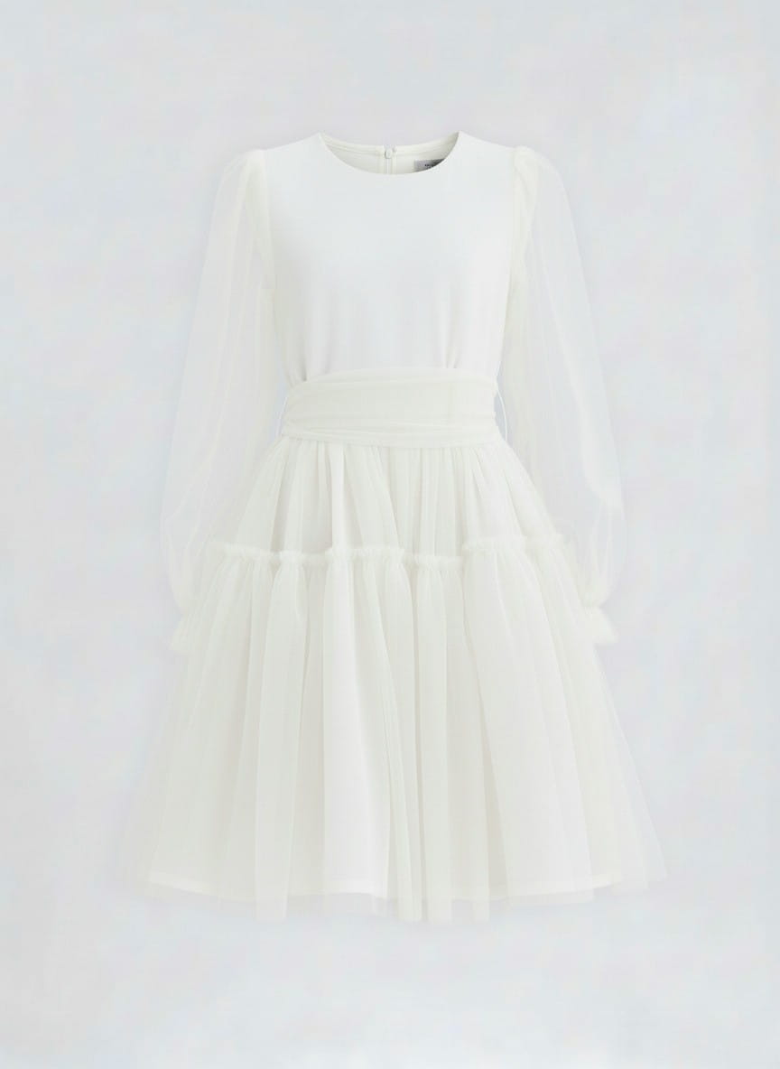 Klänningen är skapad med en känsla för balans. De långa, genomskinliga ärmarna i fin tyll ger en nästan eterisk känsla, medan den strukturerade överdelen med stående krage säkerställer en sofistikerad silhuett. Kjolen faller naturligt strax ovanför knäna – perfekt längd för att hon ska kunna springa efter kusiner i trädgården eller snurra på dansgolvet. Bakstyckets dragkedja gör det enkelt att ta på och av, medan den cremevita nyansen fungerar lika vackert mot varmt sommargräs som mot vintrig snö. Detta är en tyllklänning som inte kräver perfekt väder eller perfekt tillfälle – den skapar sitt eget.