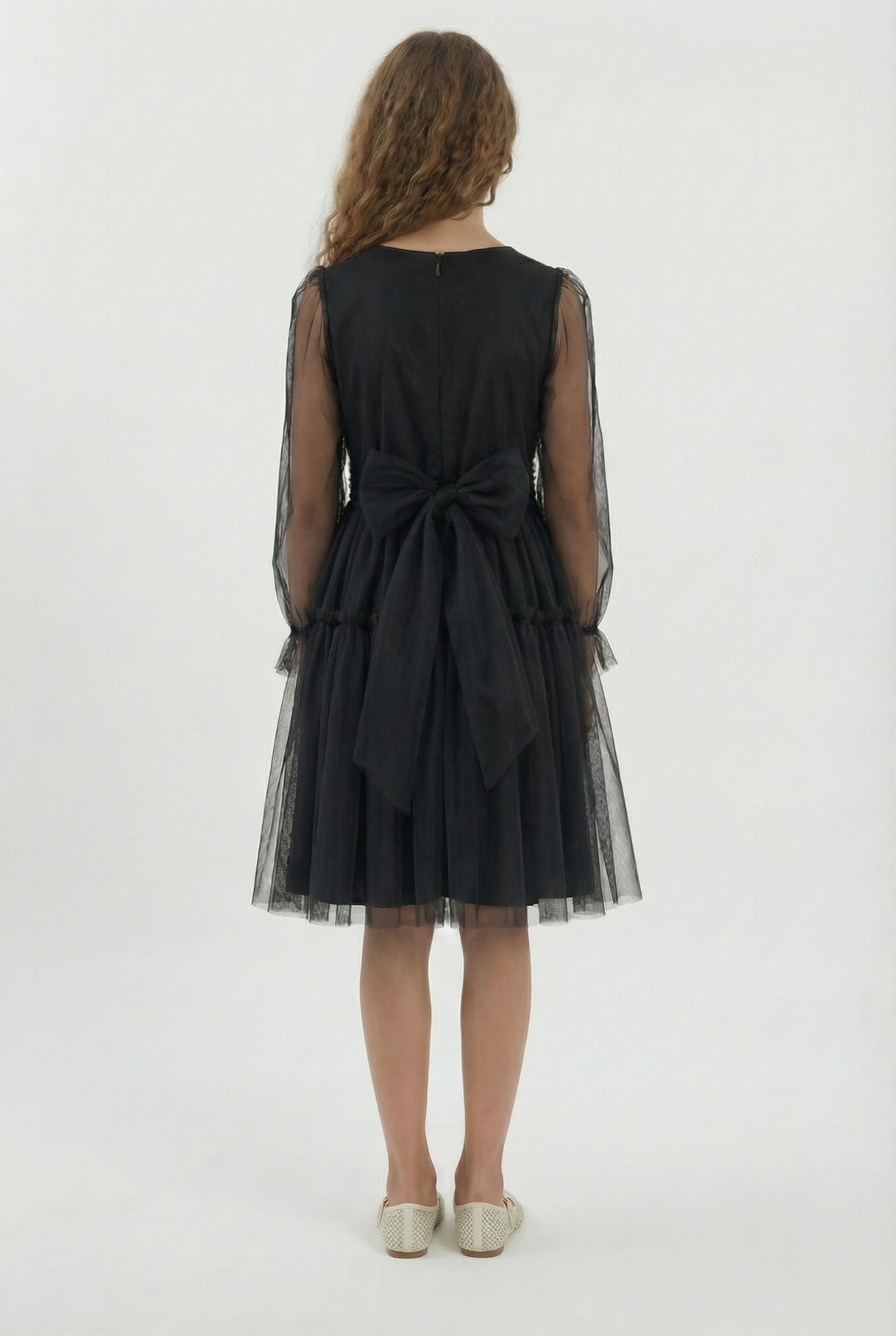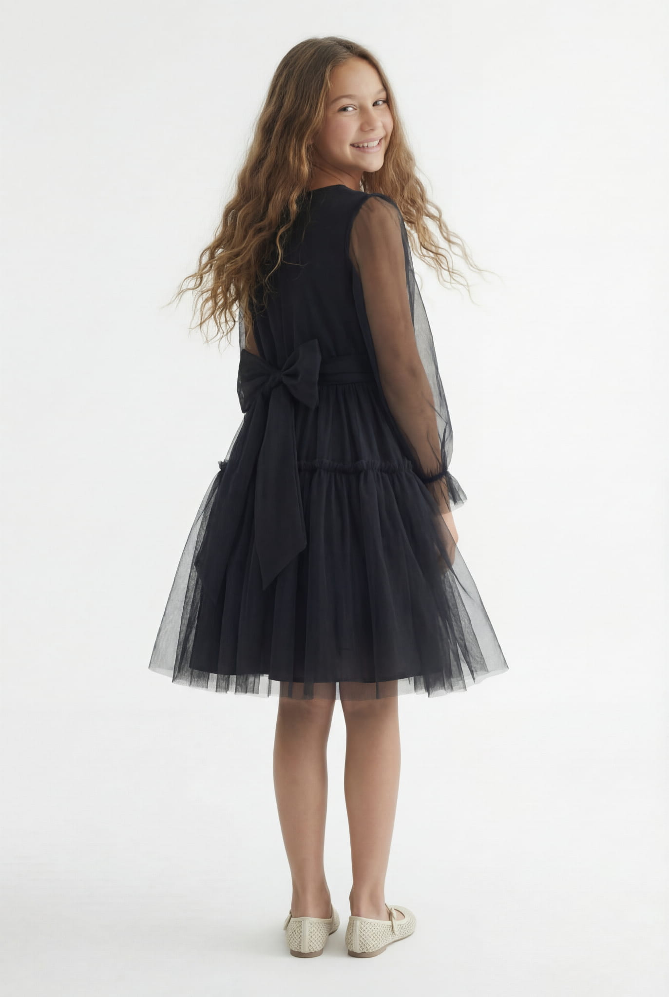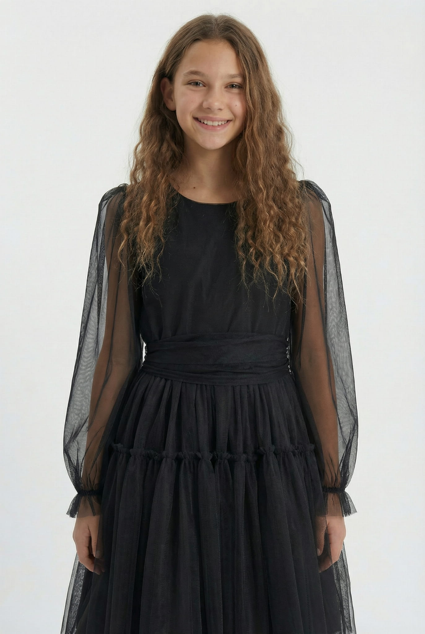 Holly i svart är den klänning som talar elegansens tysta språk. De långa ärmarna och den rika tyllen skapar en dramatisk men ändå mjuk silhuett som förvandlar din flicka till en liten prinsessa. Bomullsfodret ger en skön känsla mot huden, medan tyllbandet i midjan fullbordar looken med en raffinerad detalj. Dragkedjan på ryggen gör det enkelt att klä på och av. Holly i svart är det perfekta valet för vinterkalas, teaterbesök och alla tillfällen där elegans står i centrum.