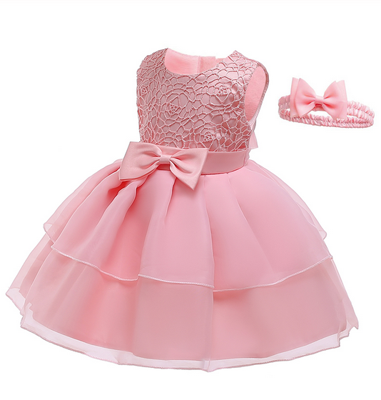 Stilfull, trendig, elegant tyllklänning för små flickor. Perfekt för ceremonier, baler, fester, bröllop och dop/kommunion. Överdelen av klänningen är dekorerad med spets, och ett påsytt blomster i midjan tillför elegans. Bak knuten med ett band i en justerbar rosett. Hela klänningen är fodrad.