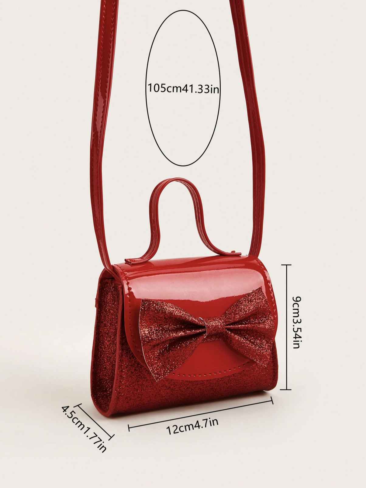 Kombinationen av elegant lackfinish och glittrande material skapar en visuell harmoni som är ovanlig att hitta i barnväskor. Den stora glitterrosetten på framsidan ger en touch av festlighet utan att överdriva, medan det justerbara axelbandet erbjuder praktisk funktionalitet för alla åldrar.
