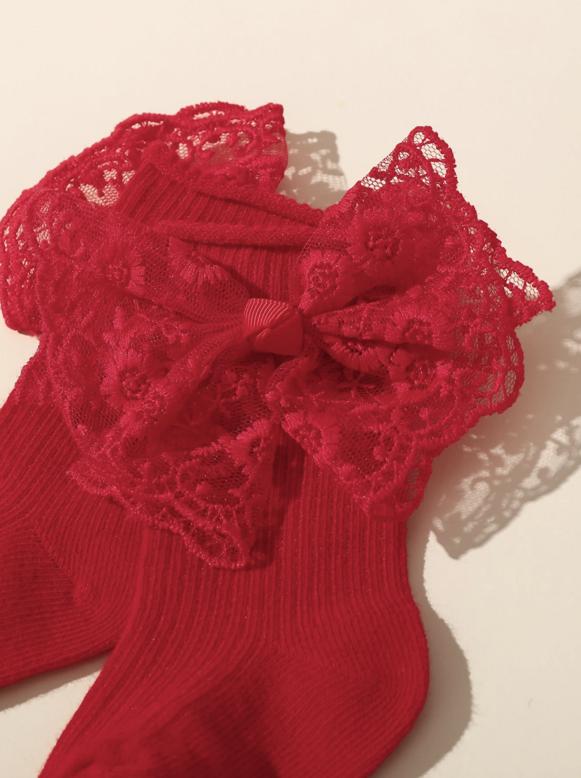 Röda Spetsstrumpor med Matchande Hårband – Elegant Set för Flickor