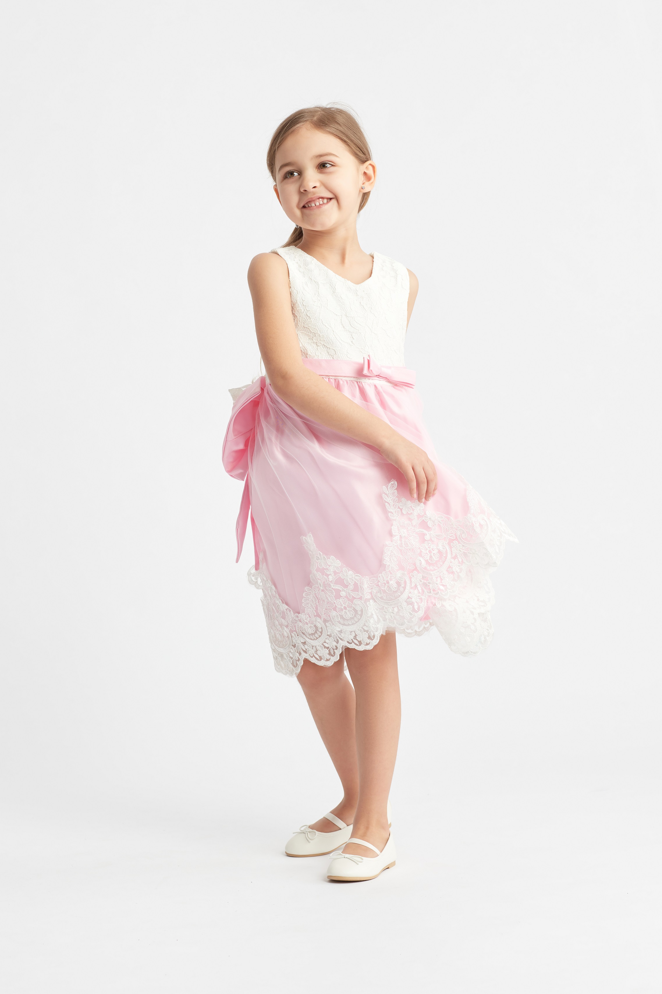 Stilfull, moderiktig, elegant, tyll festklänning för flickor. Perfekt för ceremonier, baler, mottagningar, bröllop och bröllopsfester, födelsedagar samt första kommunions- / dopdagar. Överdelen av klänningen är dekorerad med tyll, elegansen förhöjs av en avtagbar blomma vid midjan, bak knyts den i en justerbar rosett. Nedre delen av klänningen består av två lager tyll och två foder.