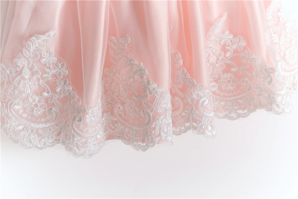 Stilfull, moderiktig, elegant, tyll ceremoniklänning för flickor. Perfekt för festligheter, baler, mottagningar, bröllop och bröllopsfester, födelsedagar samt första kommunions- / dopdagar. Överdelen av klänningen är dekorerad med tyll, och dess elegans förhöjs av en avtagbar blomma vid midjan, bak knyts den i en justerbar rosett. Nedre delen av klänningen består av två lager tyll och två foder.