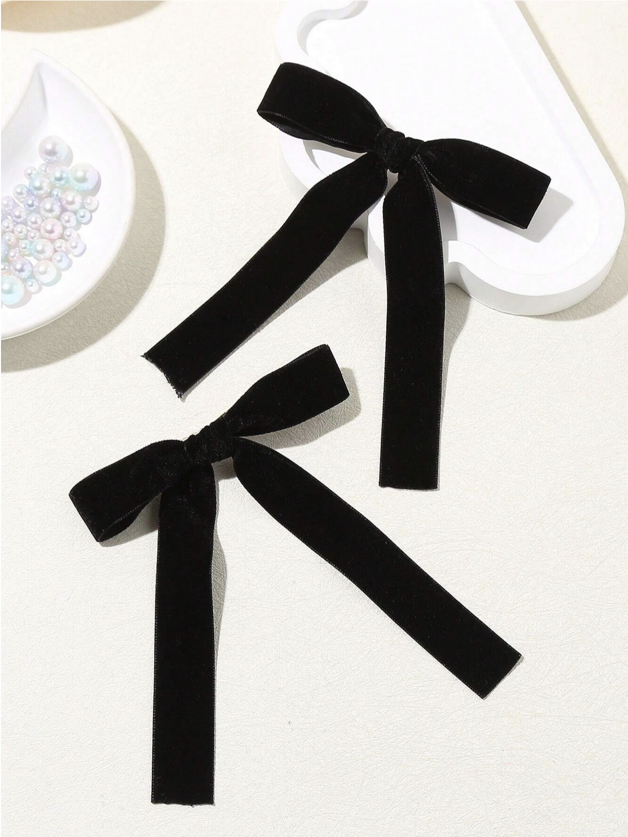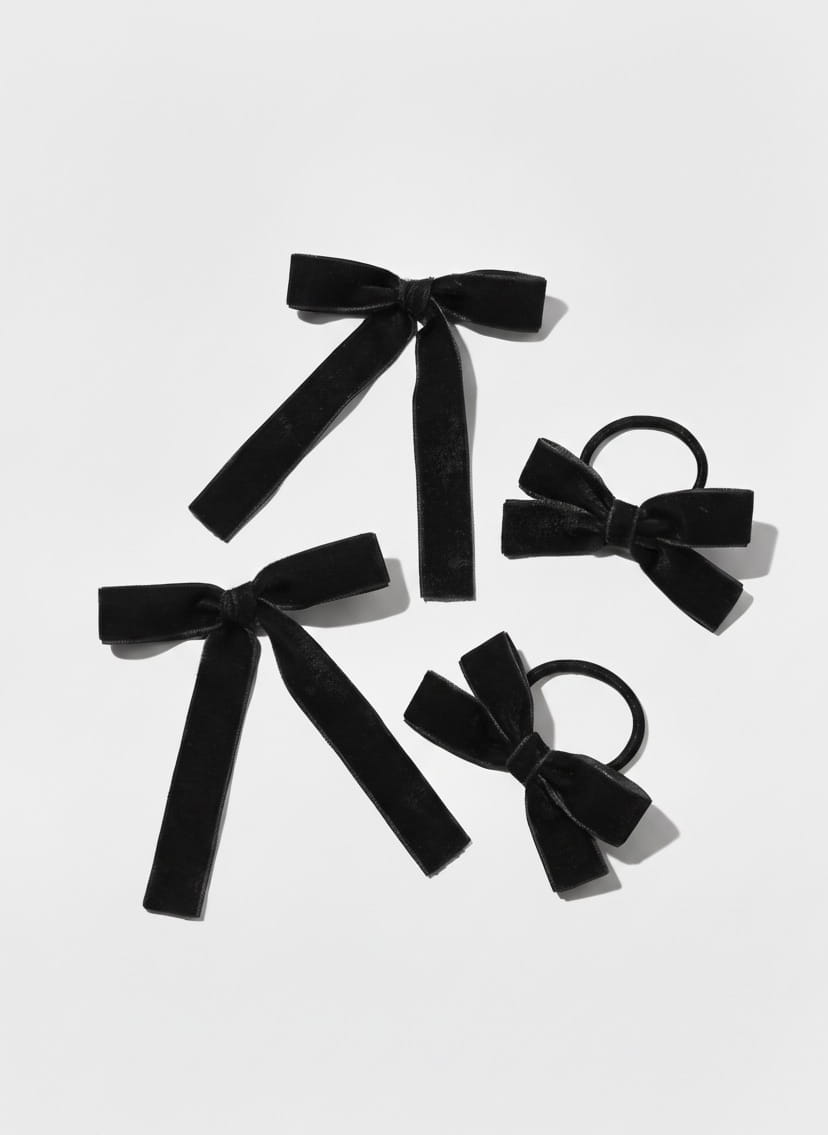 Ett set med svarta sammetsrosetter för flickor som förvandlar varje frisyr till en liten högtid. Fyra genomtänkta håraccessoarer – två hårspännen och två hårsnoddar – som ger en diskret men tydlig känsla av lyx, från förskolans maskerad till bröllopsfestens dansgolv.