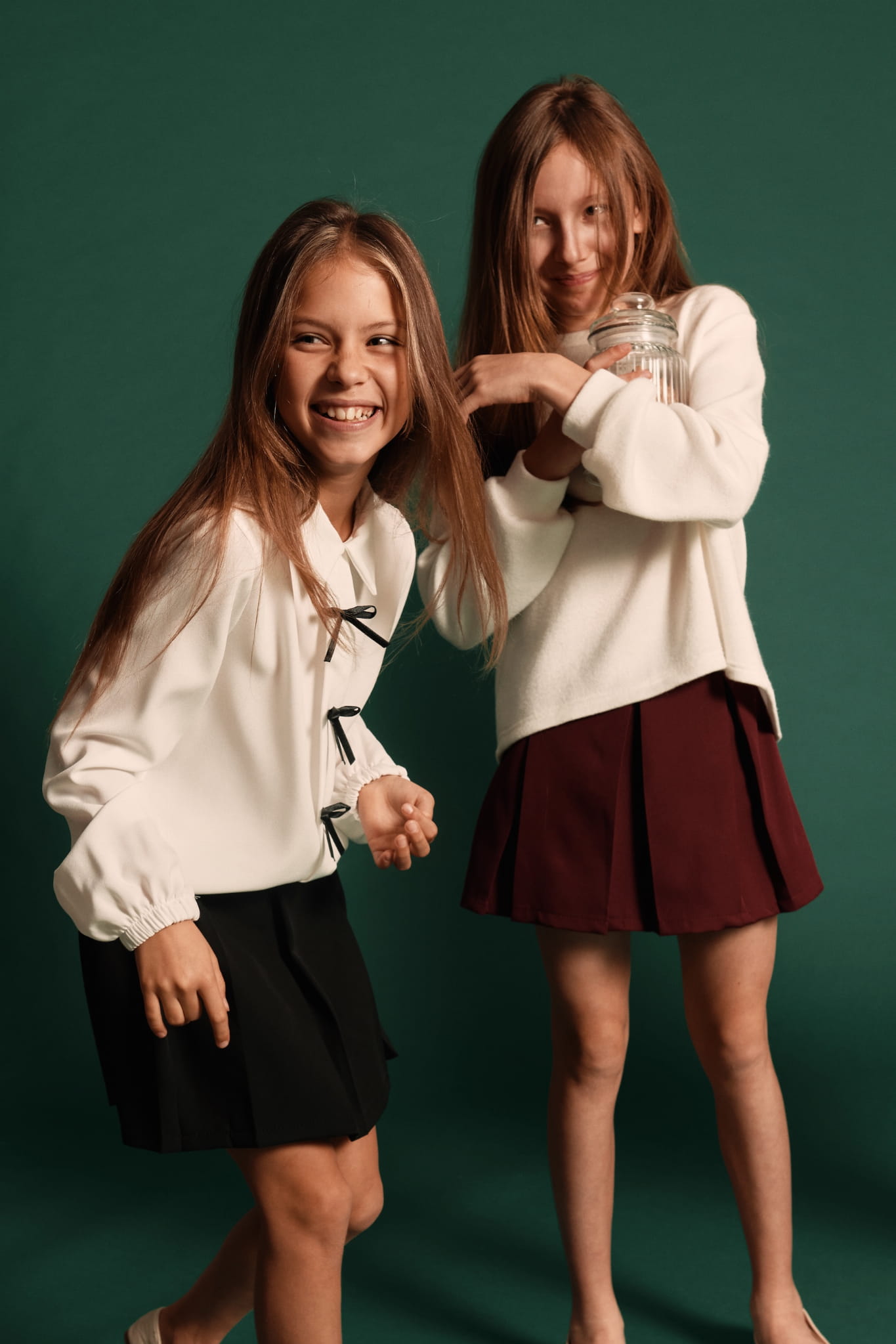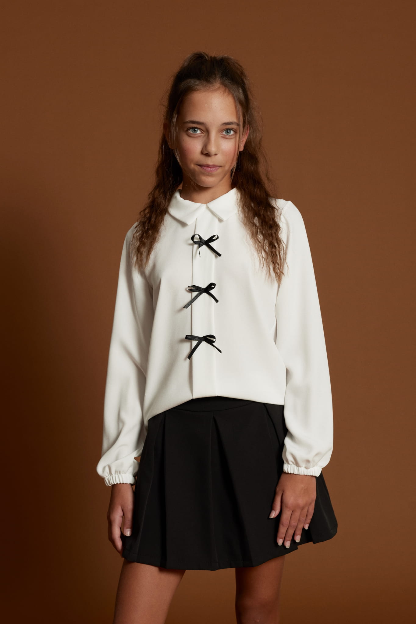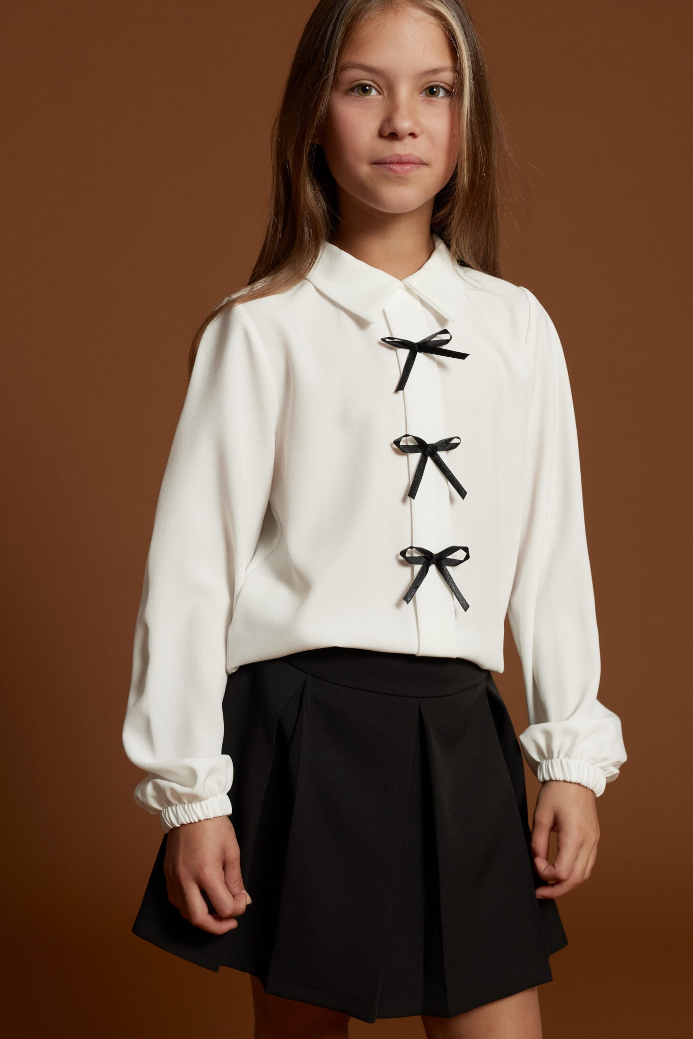 Det finns ögonblick i en flickas liv som förtjänar att fångas i tidlös elegans. När hon kliver in i rummet i denna tvådelade uppsättning – med den mjuka ekrävita blusen prydd med tre sidenrosetter och den svarta kjolen som döljer hemliga shorts – blir varje steg en del av familjens dyrbara minnen.