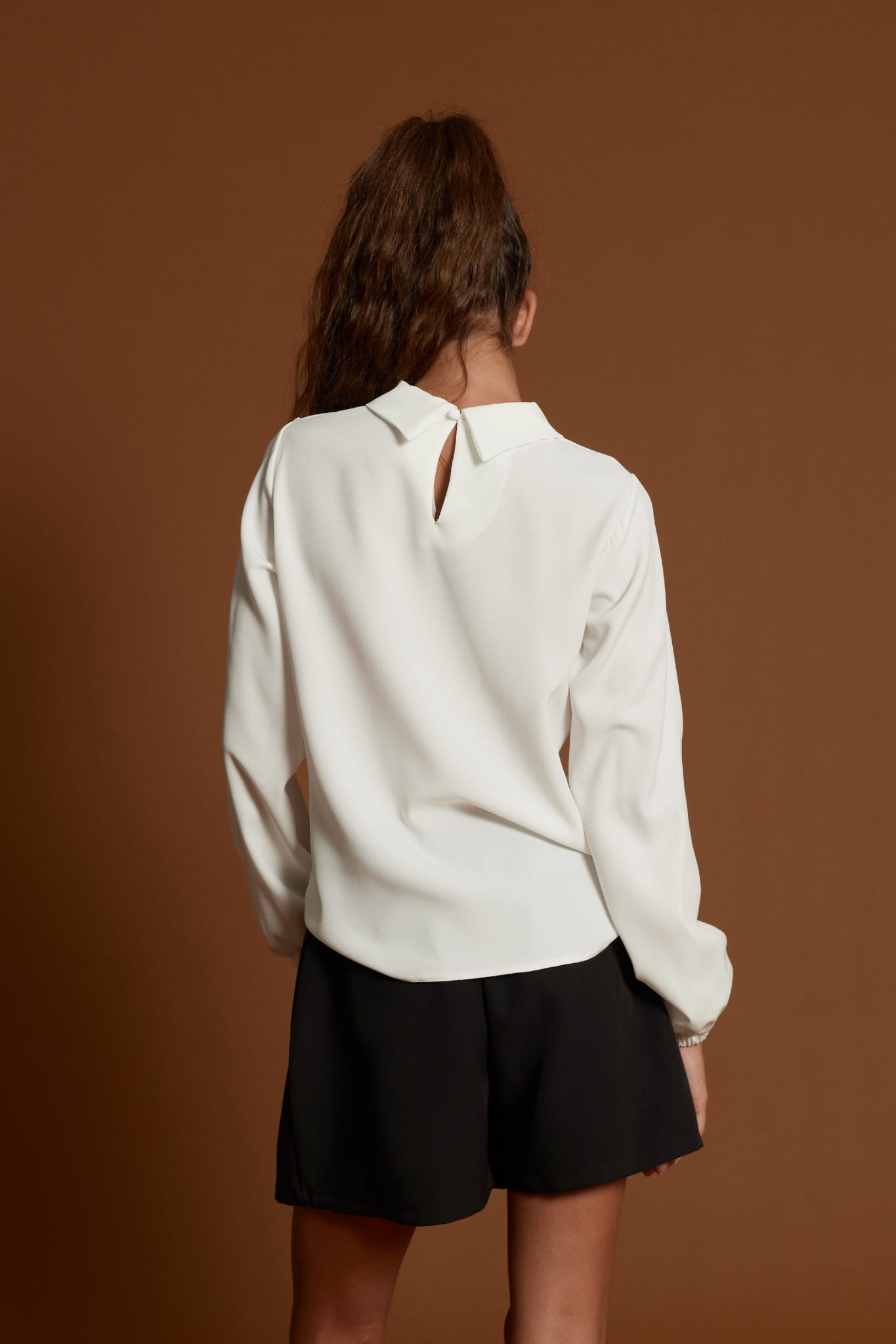 - Tvådelad uppsättning bestående av ekrävit blus med klassiskt krage och svart kjol-shorts kombination