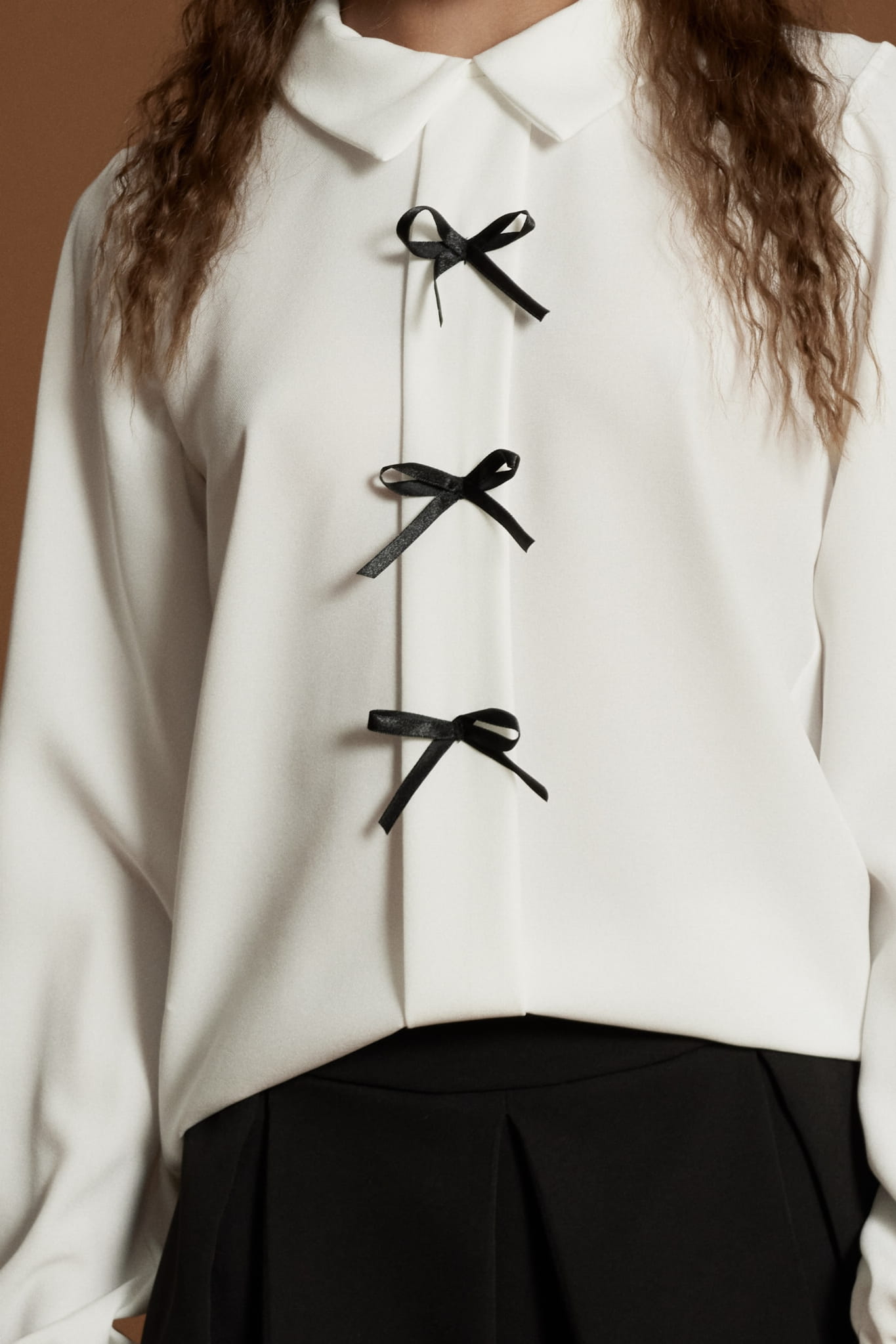 - Tre eleganta svarta sidenrosetter som pryder blusens framstycke – en detalj som fångar blicken utan att skrika efter uppmärksamhet