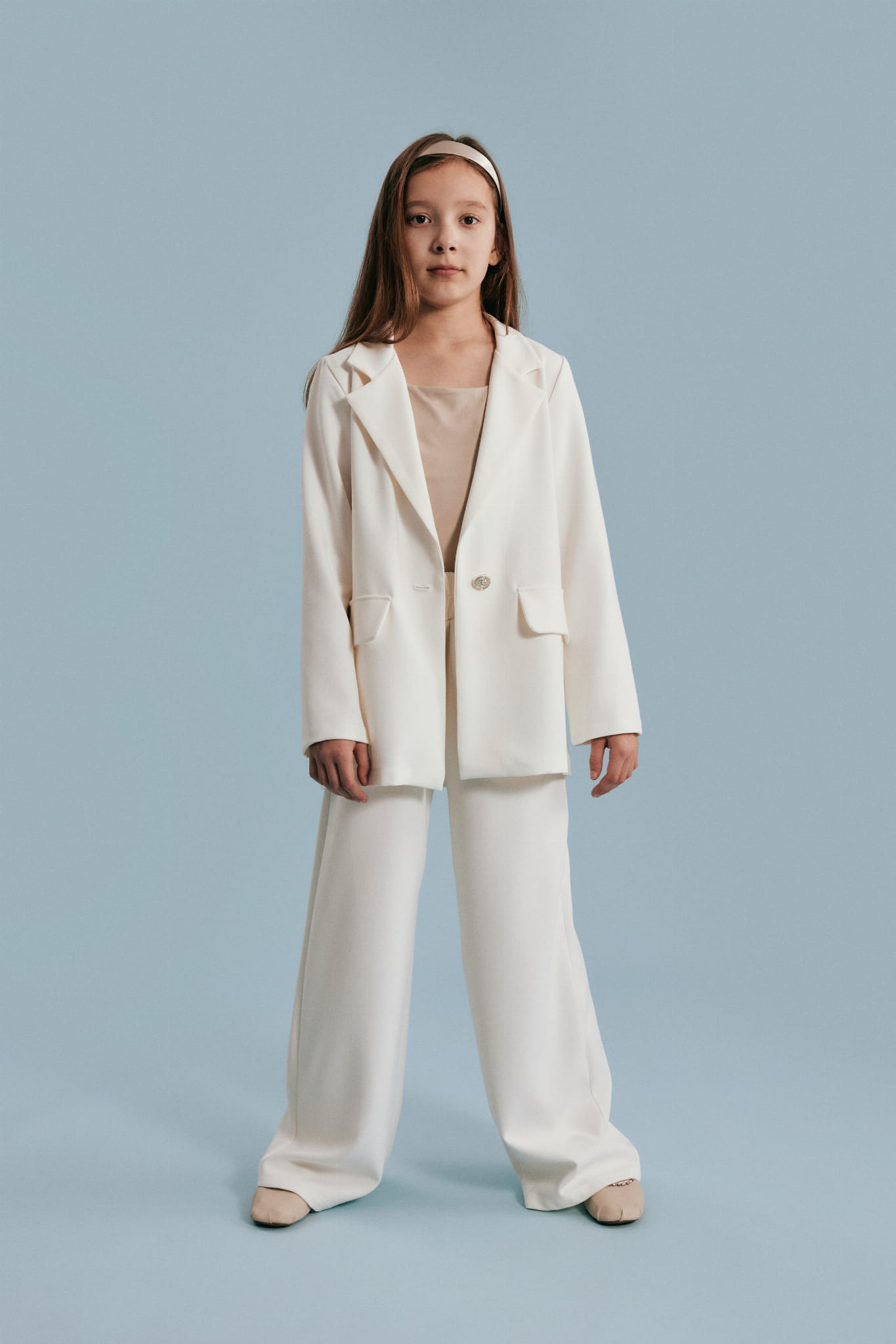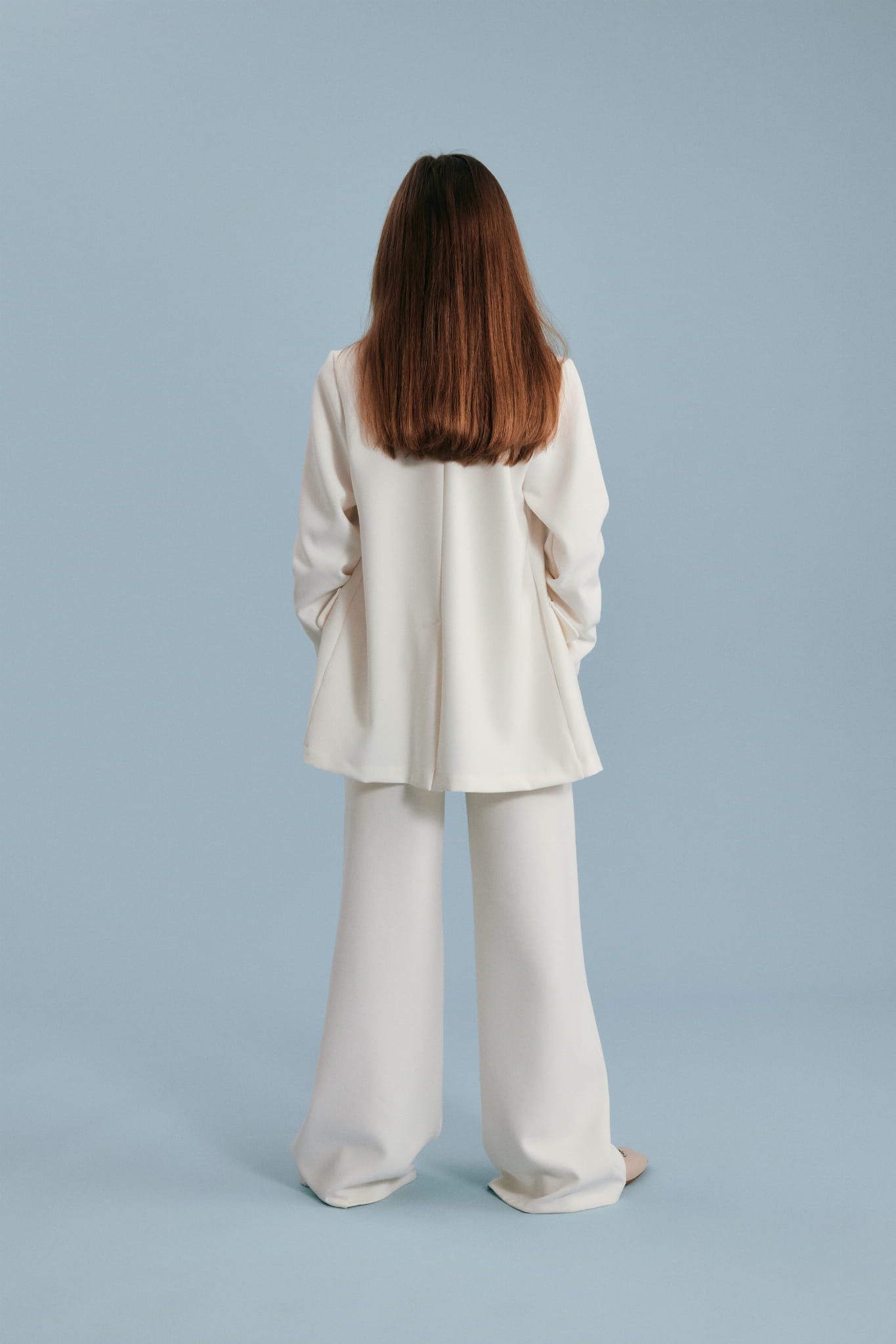 Huvudinslaget i kostymen är en oversized kavaj, som knäpps med en elegant knapp och är perfekt anpassad till de senaste modetrenderna. Den lediga passformen ger rörelsefrihet och en sofistikerad look. Ärmarna är fodrade för att enkelt kunna vikas upp – en praktisk detalj som gör det möjligt att justera längden efter behov.
