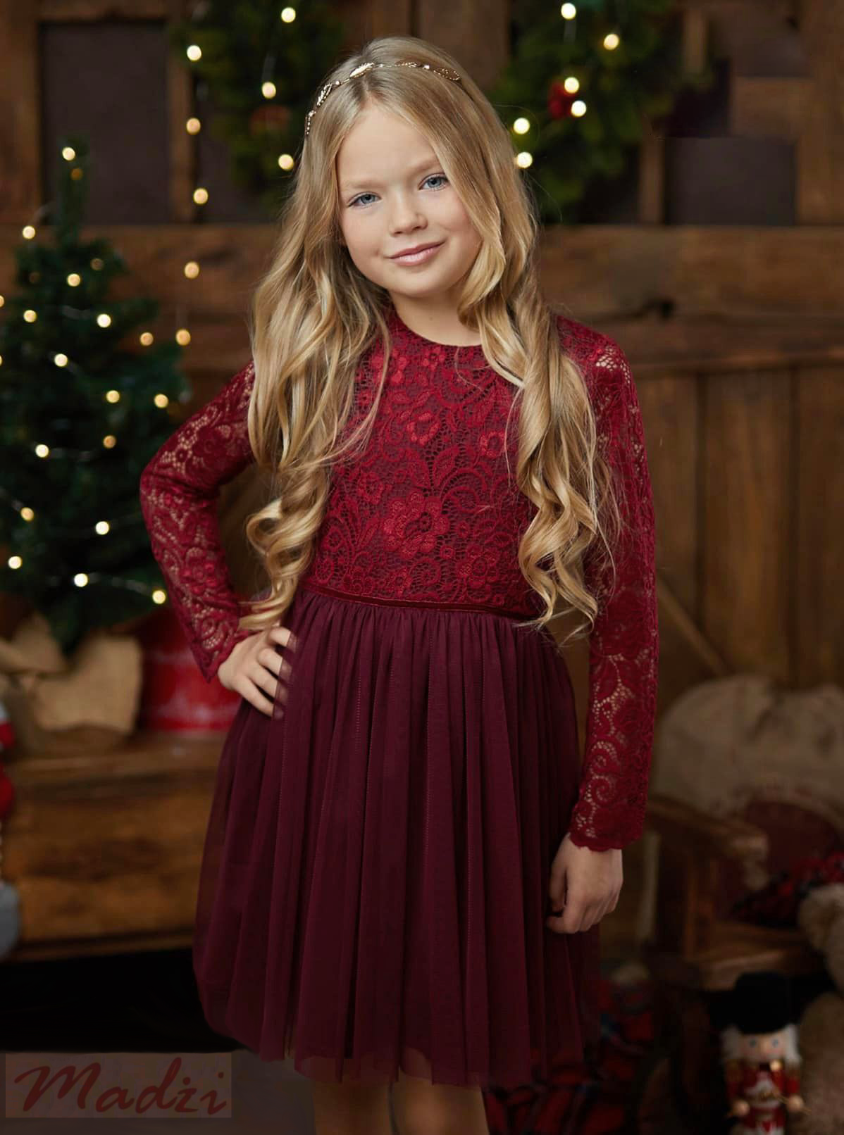 En stilren, modern och elegant klänning för flickan Jasmina i färgen vinrött.