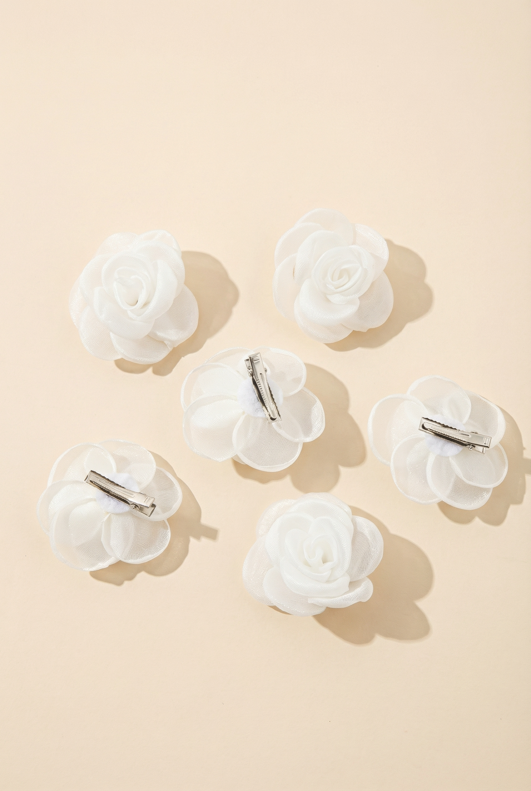 Vita eleganta hårspännen för flickor 6-pack – Blommor i organza för bröllop och dop